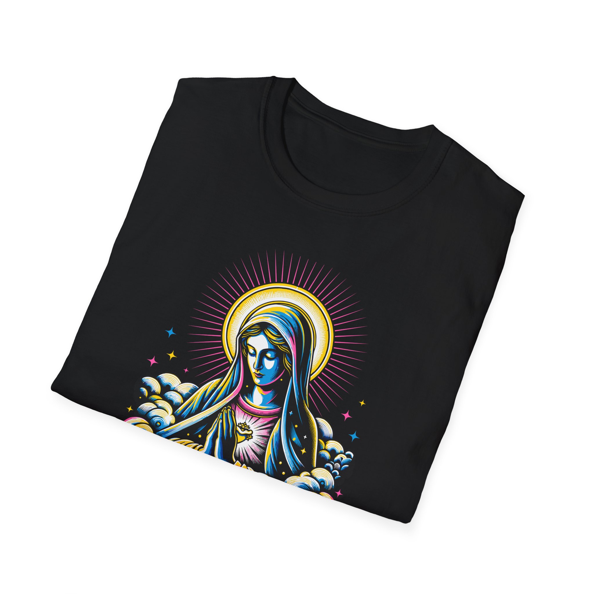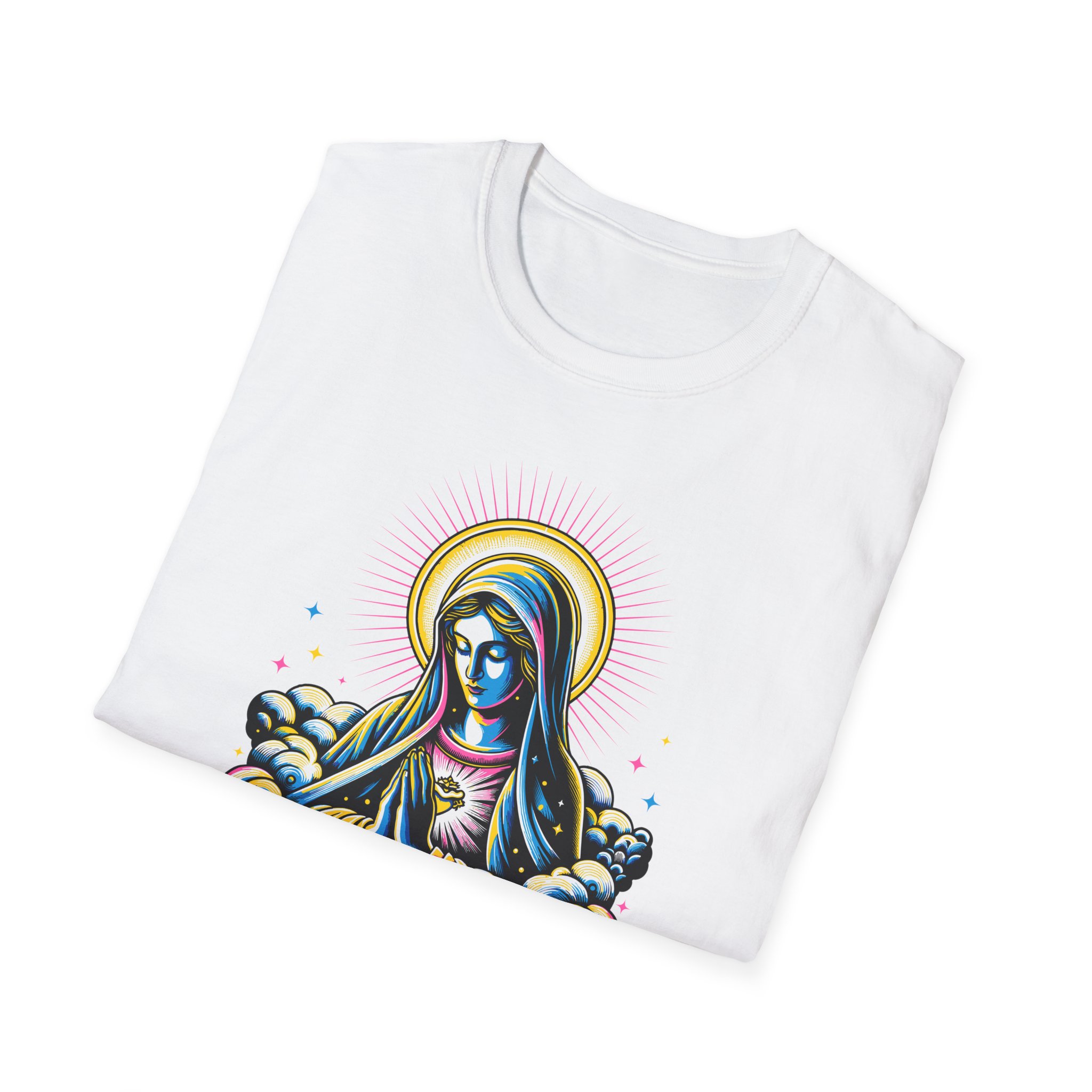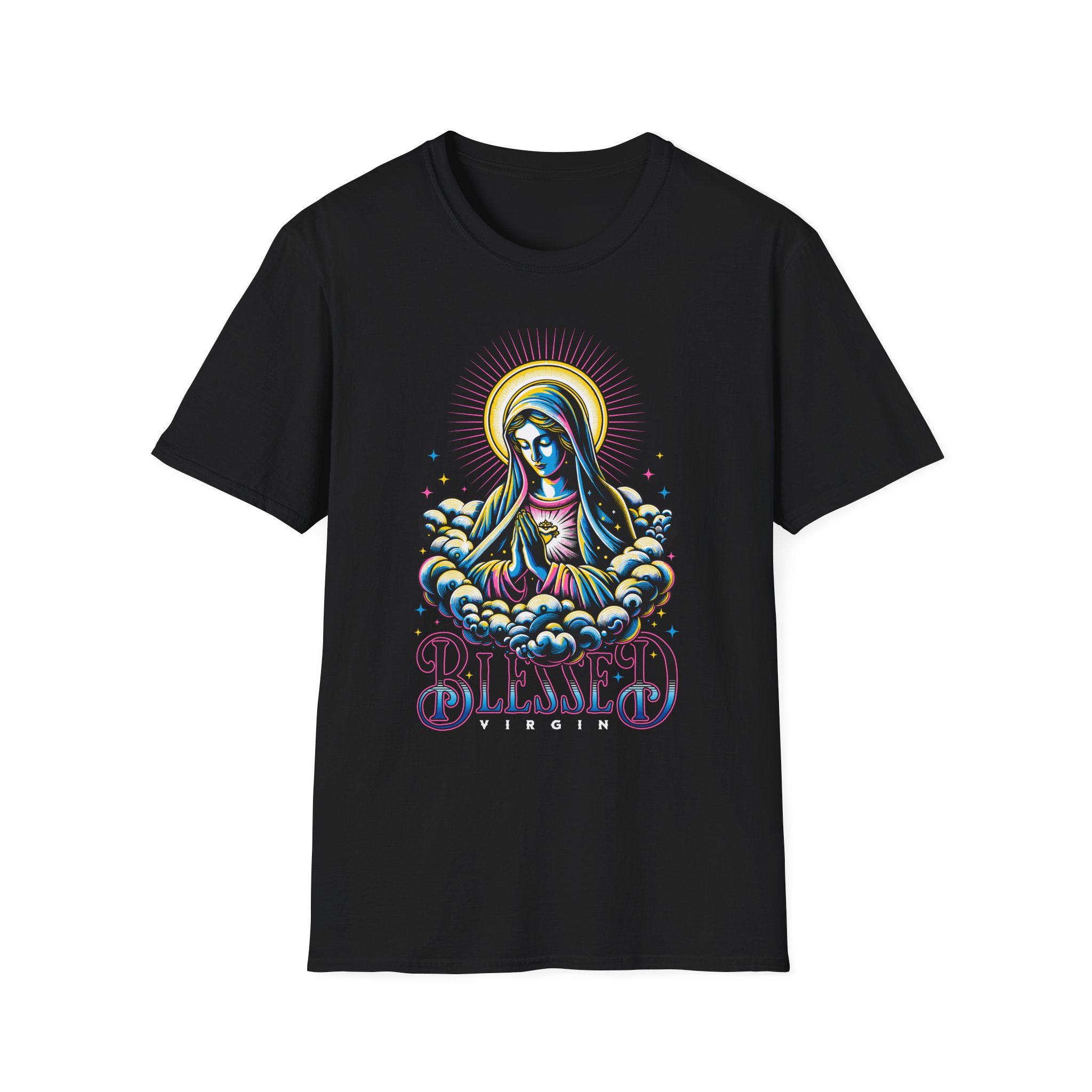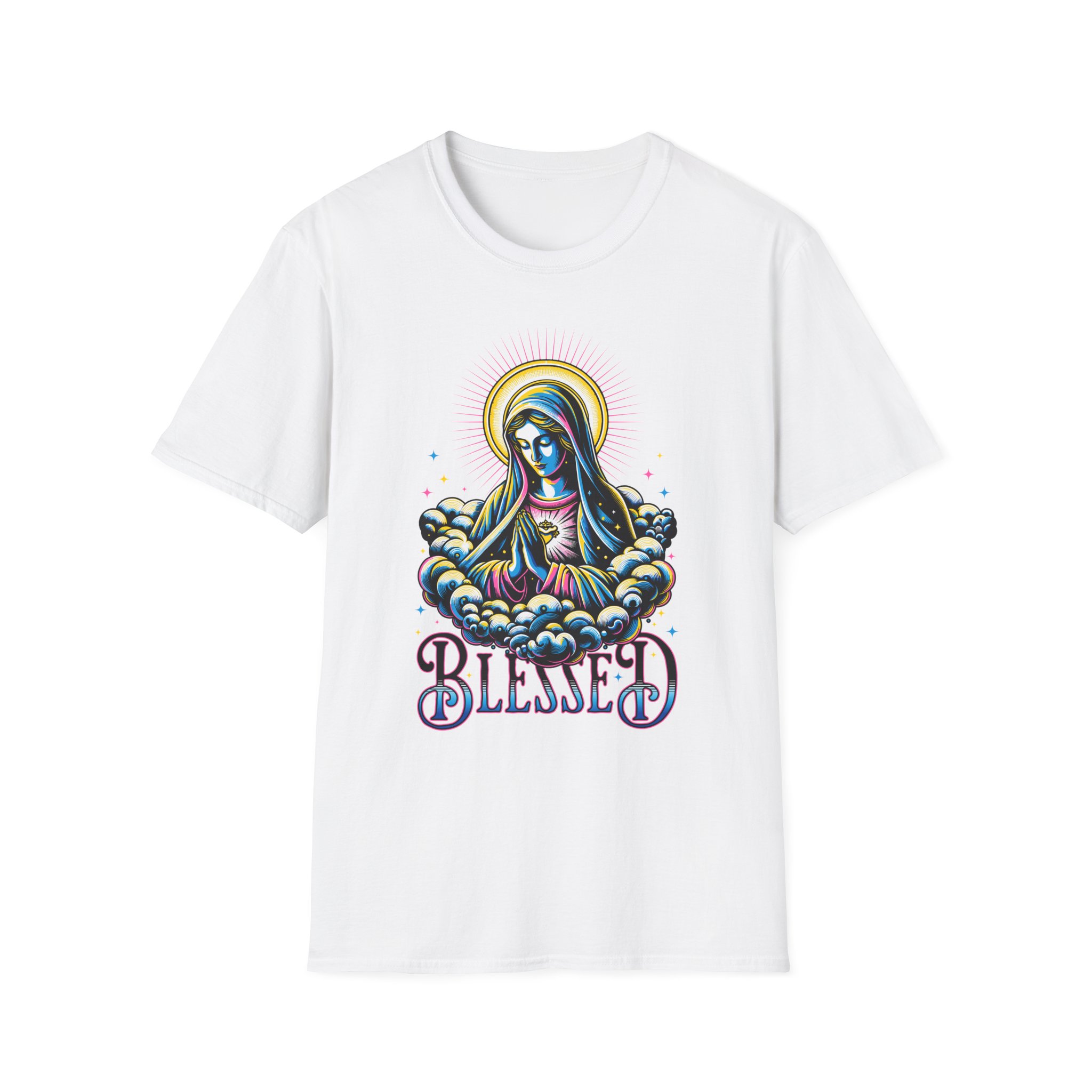 A soft, lightweight tee that carries quiet devotion. This crew-neck shirt features a vibrant illustration of a serene Madonna cradled in clouds, halo aglow, with the word “Blessed” woven beneath in hand-lettered script. The image sits centered on a clean white canvas, so the colors pop while the shirt stays easy to wear. It drapes softly across the shoulders and moves with you—made for days when you want to wear your faith gently and with calm confidence. Slip it on for morning coffee, church gatherings, or slow afternoons with family; it feels familiar from the first wear and holds its shape wash after wash.