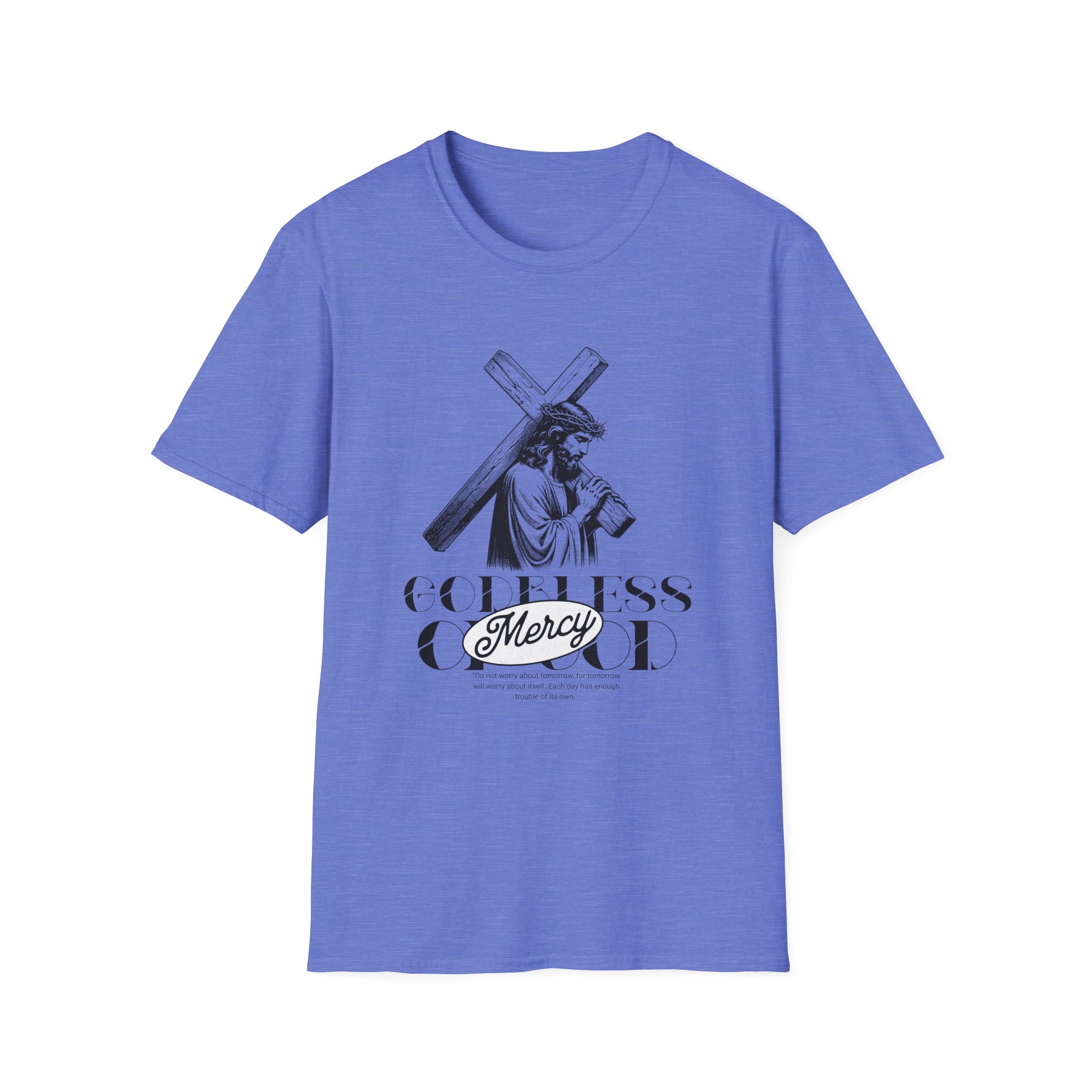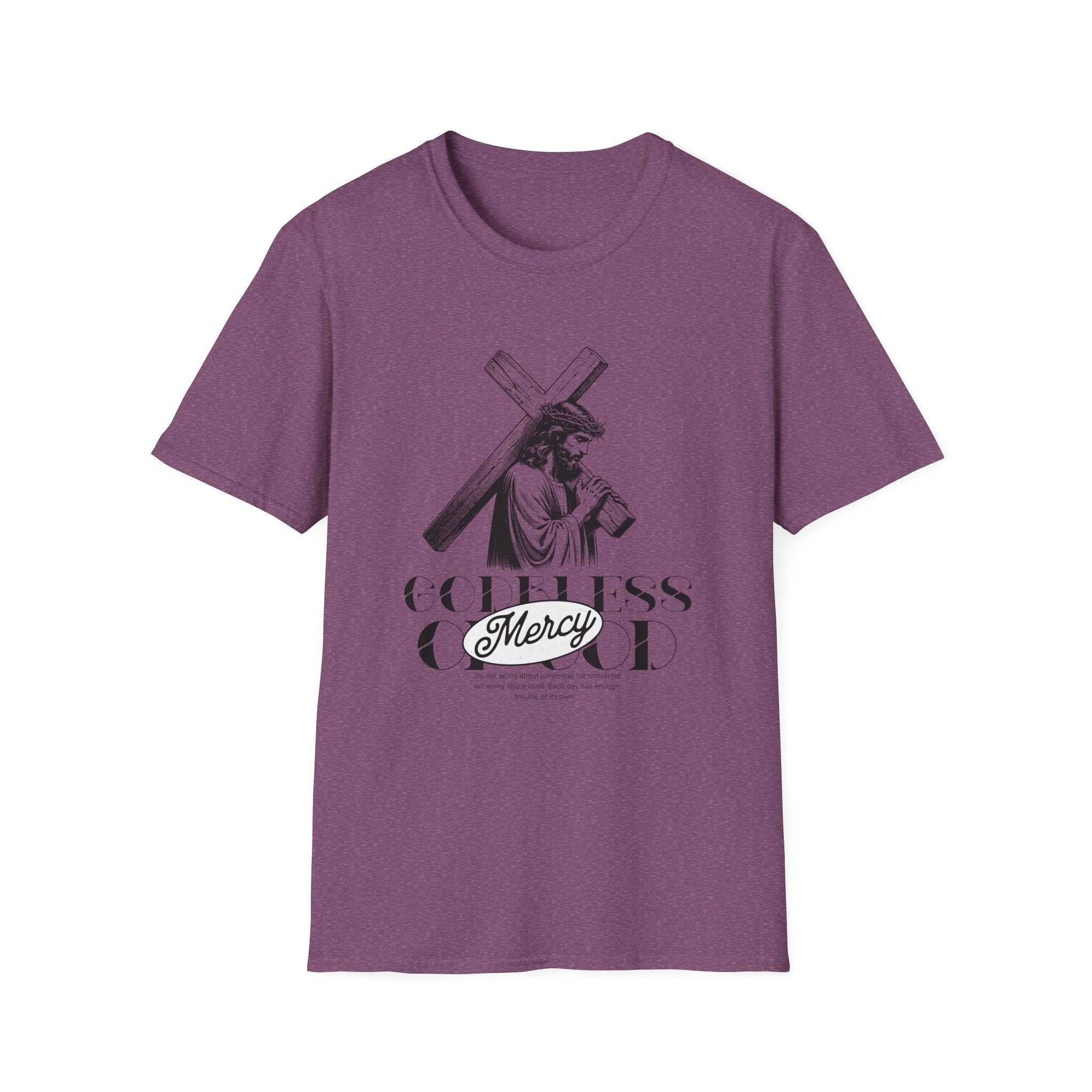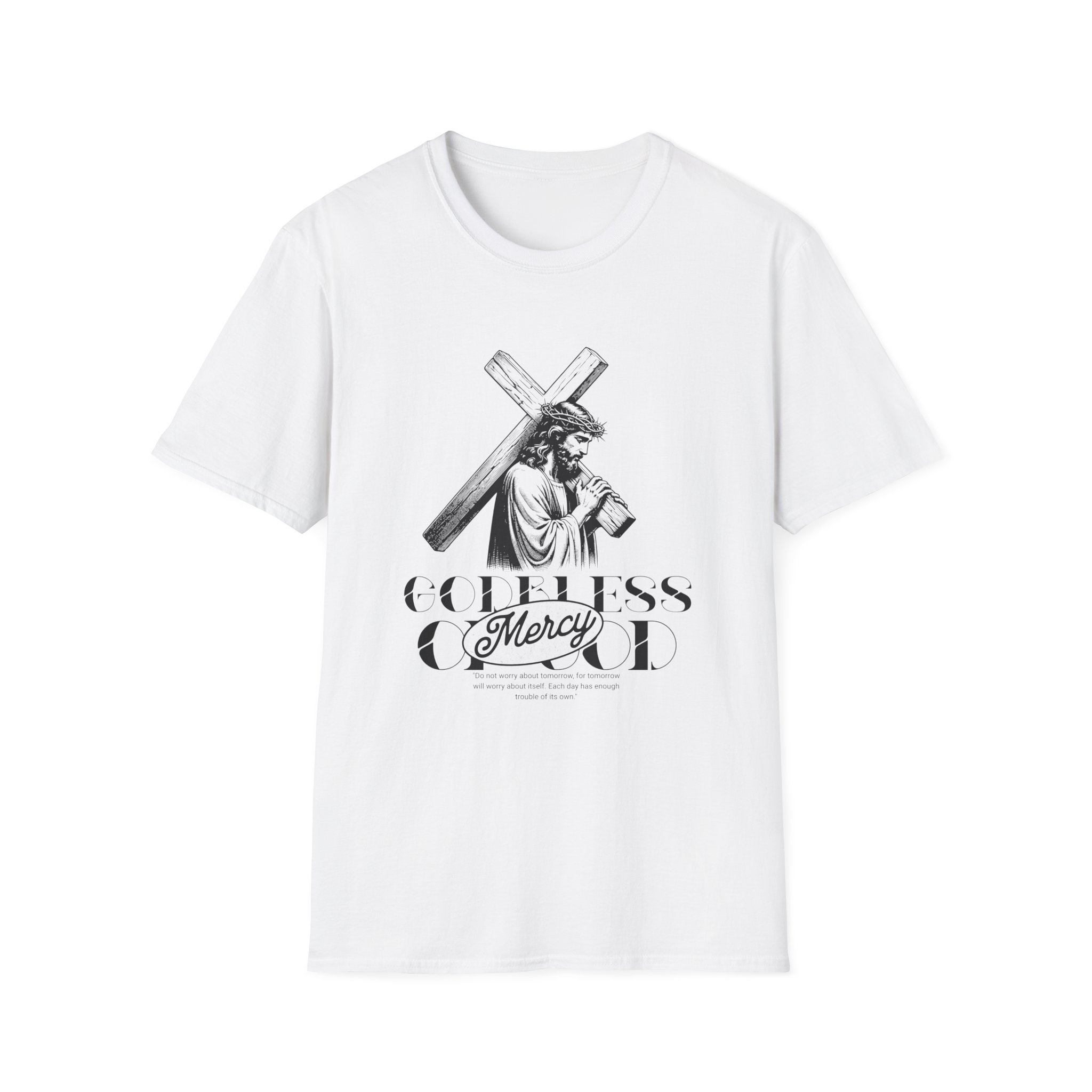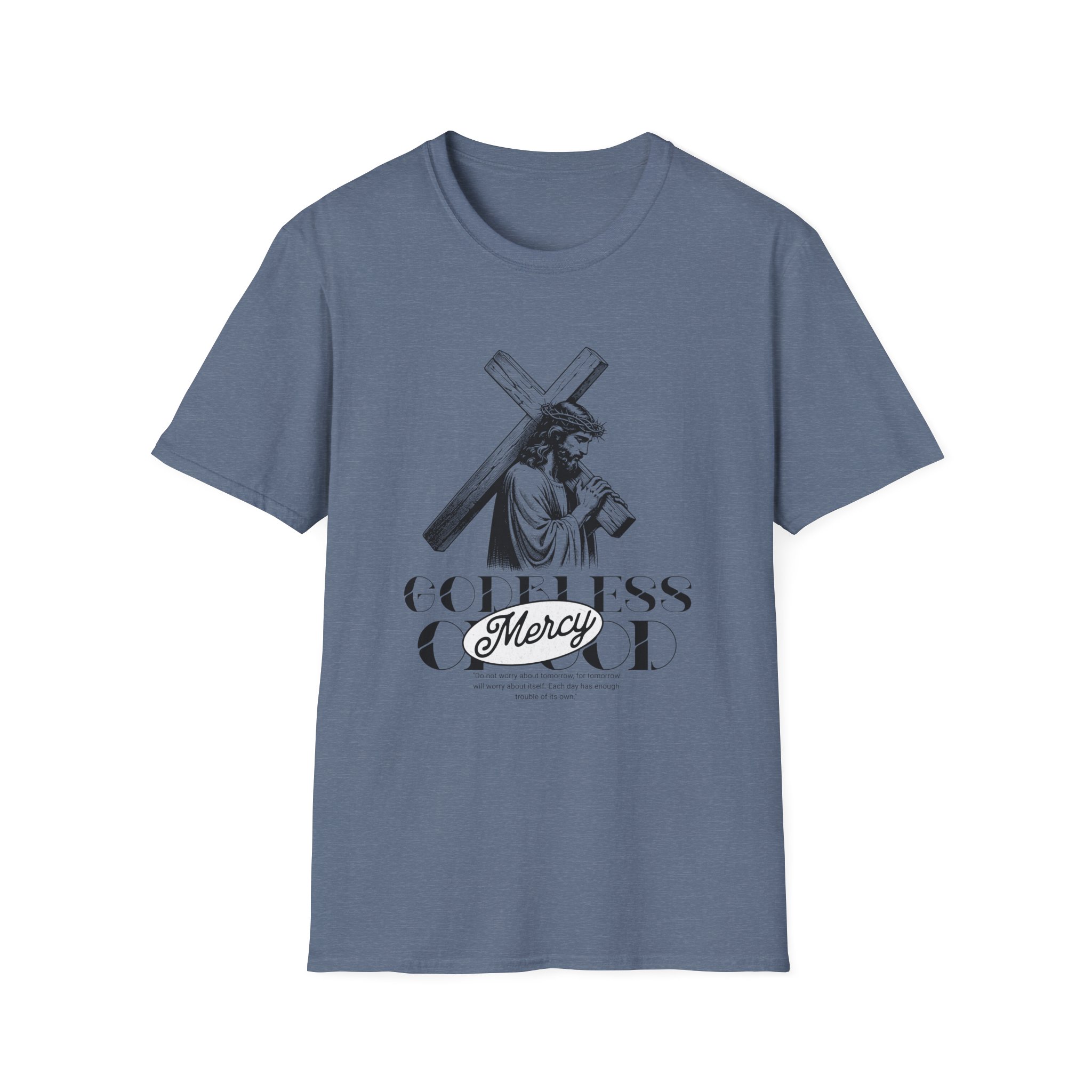 A soft, breathable tee that wears like a quiet statement. This lightweight cotton shirt drapes comfortably over the shoulders and carries a refined black-and-white illustration across the chest — a contemplative figure bearing a cross with the word “Mercy” framed beneath. It feels lived-in from the first wear: smooth ring-spun cotton, a classic crew neck, and a clean, seam-free body that keeps the silhouette simple and versatile. Subtle details — a ribbed collar that holds its shape, twill shoulder tape for stability, and a tear-away pearlized label — make it effortless to wear all day. For those who want clothing that speaks softly about faith, reflection, or meaningful design, this tee slips easily into devotional Sundays, quiet mornings, or layered looks for cooler evenings.