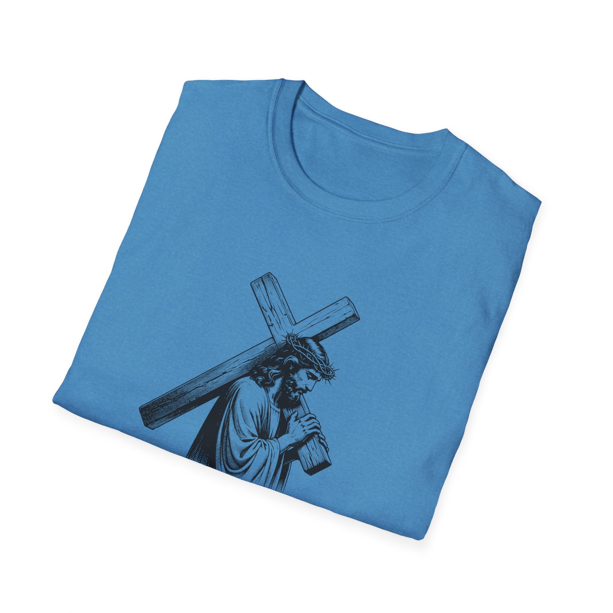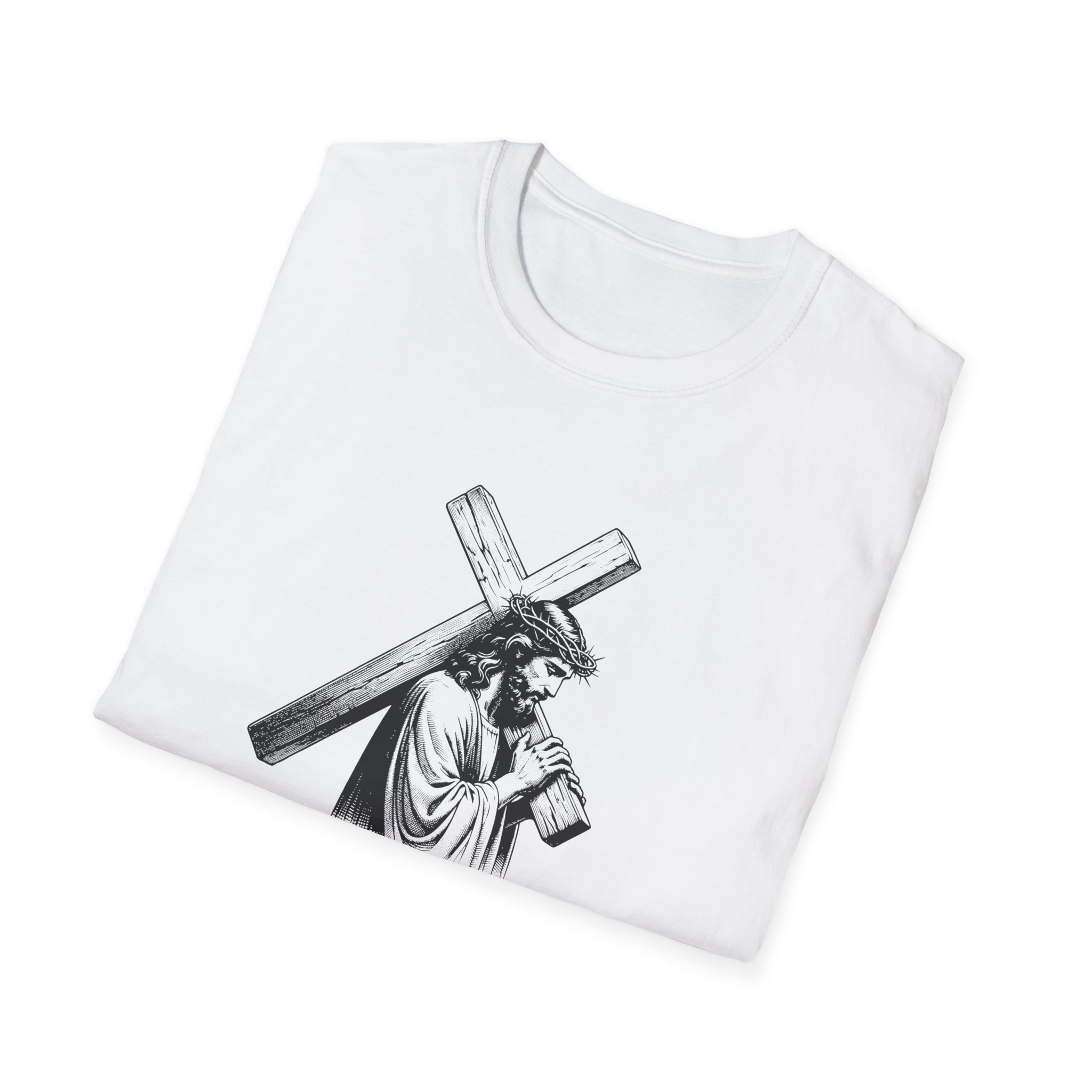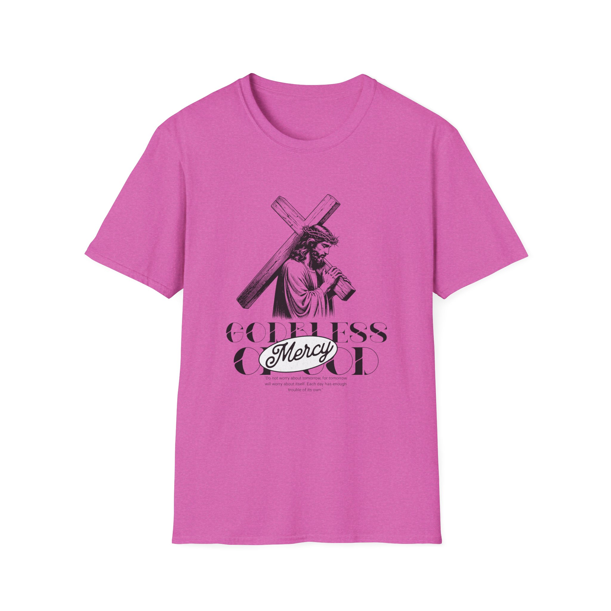A soft, breathable tee that wears like a quiet statement. This lightweight cotton shirt drapes comfortably over the shoulders and carries a refined black-and-white illustration across the chest — a contemplative figure bearing a cross with the word “Mercy” framed beneath. It feels lived-in from the first wear: smooth ring-spun cotton, a classic crew neck, and a clean, seam-free body that keeps the silhouette simple and versatile. Subtle details — a ribbed collar that holds its shape, twill shoulder tape for stability, and a tear-away pearlized label — make it effortless to wear all day. For those who want clothing that speaks softly about faith, reflection, or meaningful design, this tee slips easily into devotional Sundays, quiet mornings, or layered looks for cooler evenings.