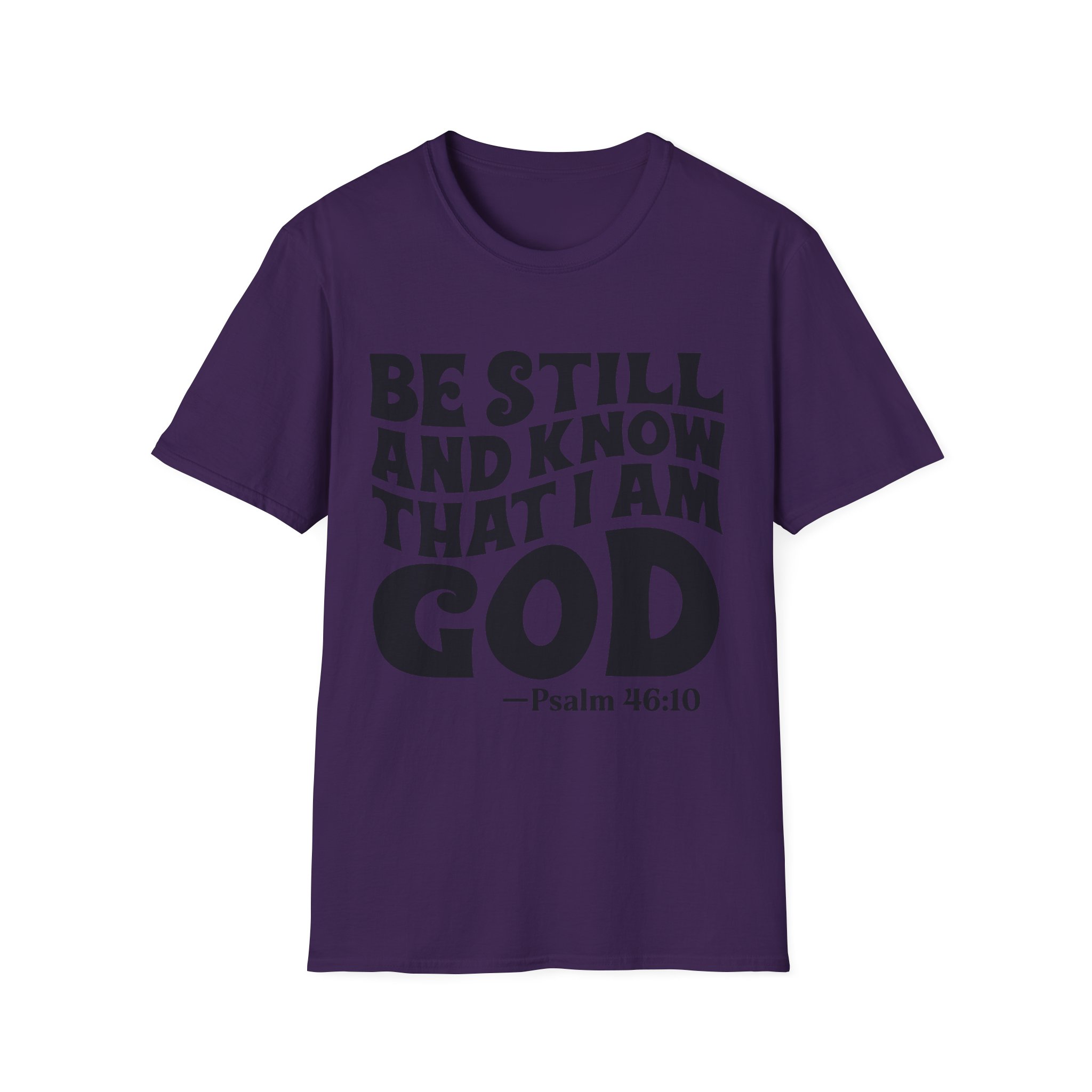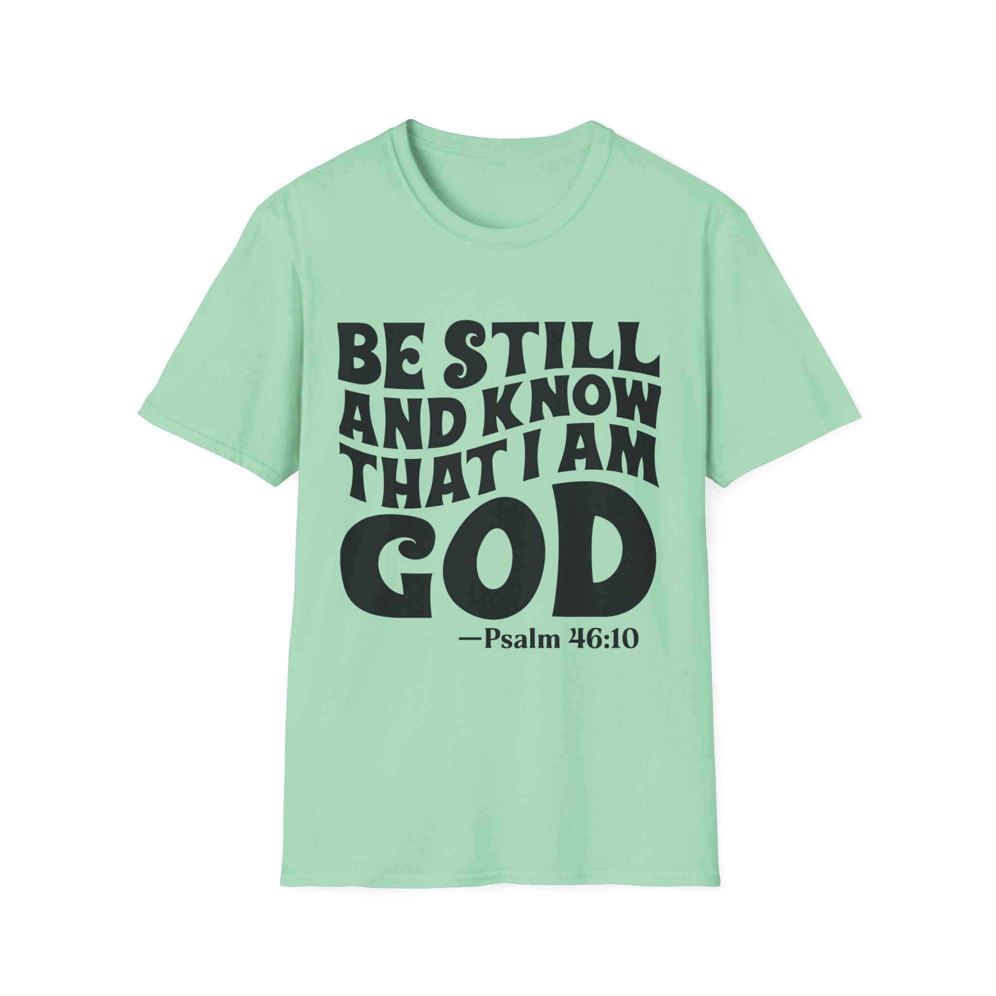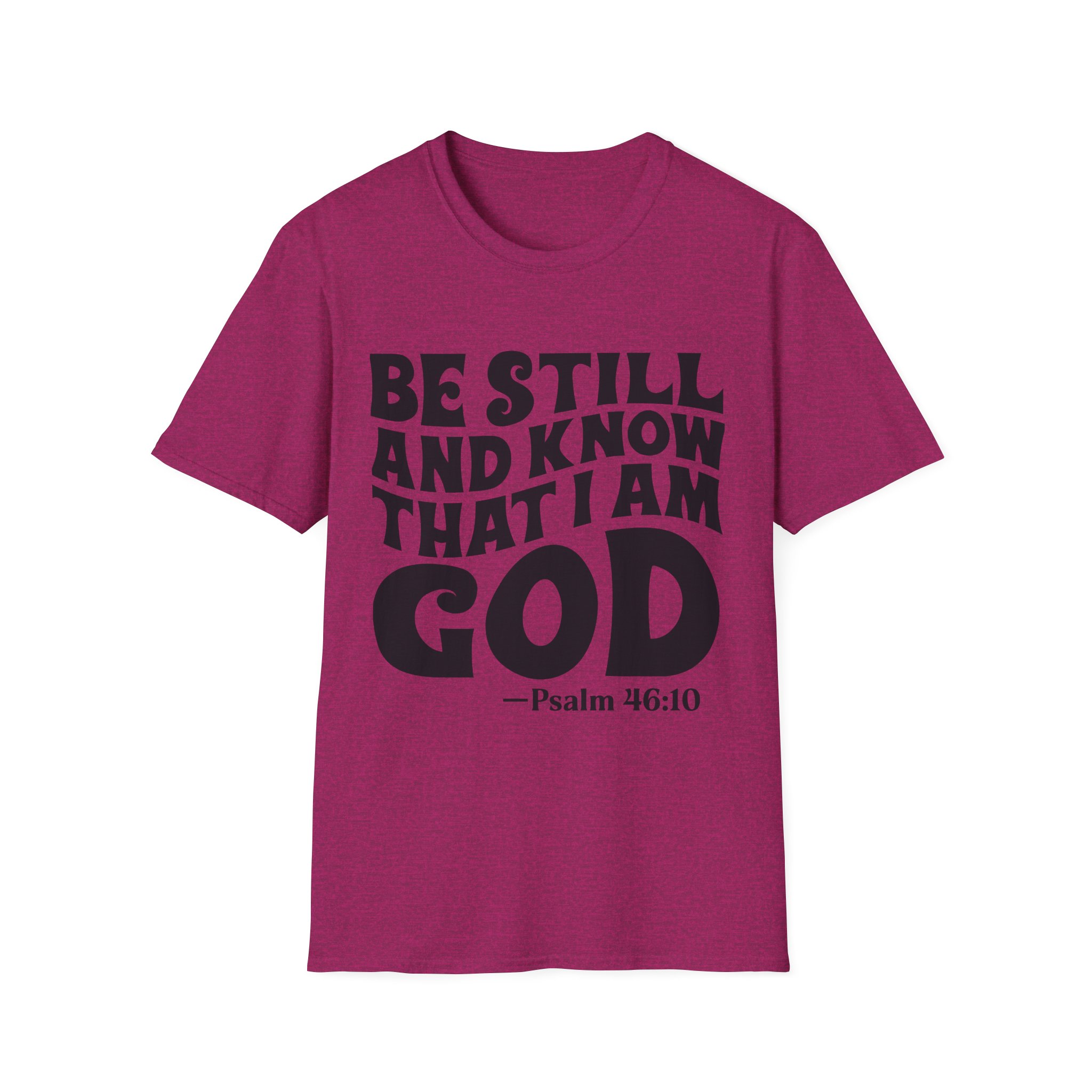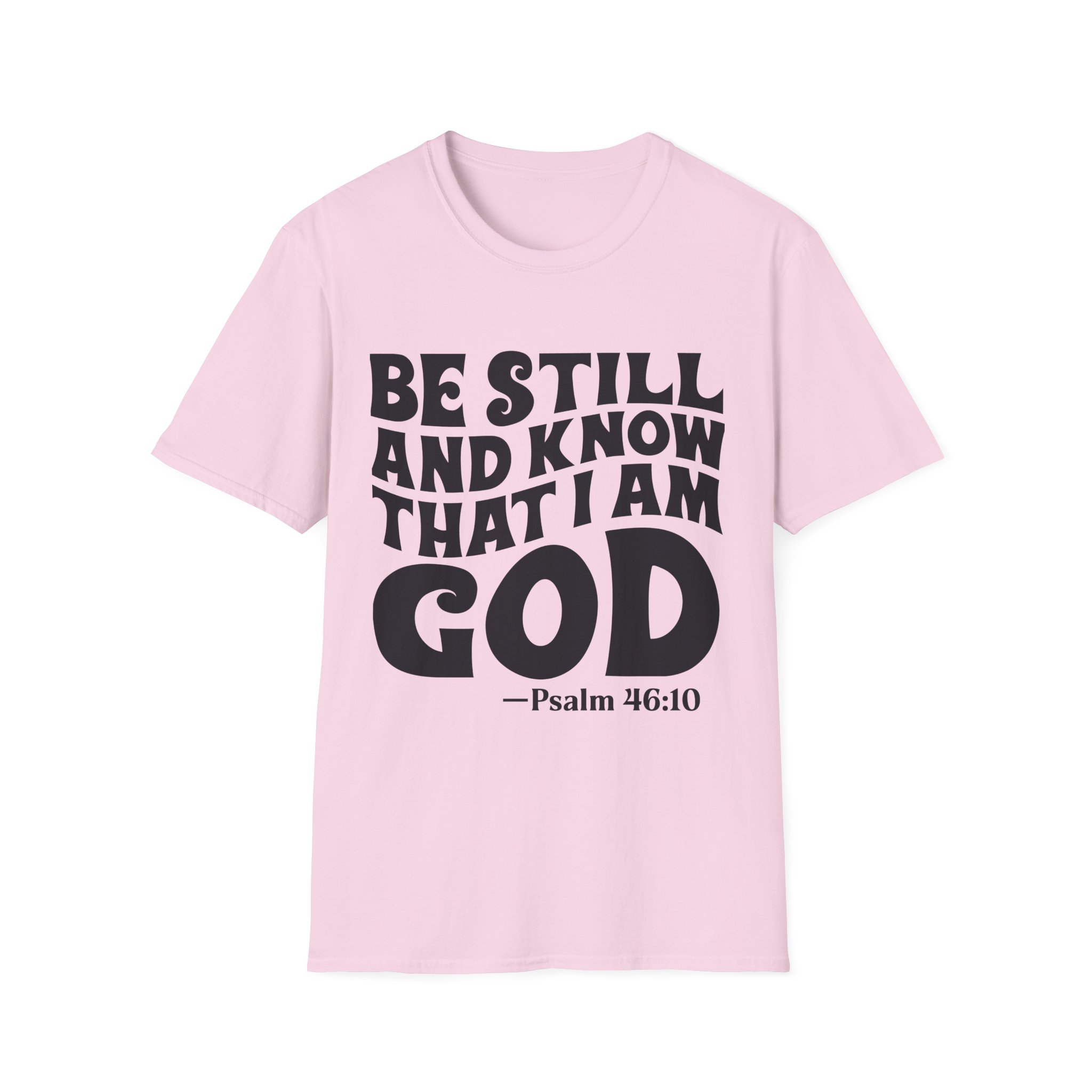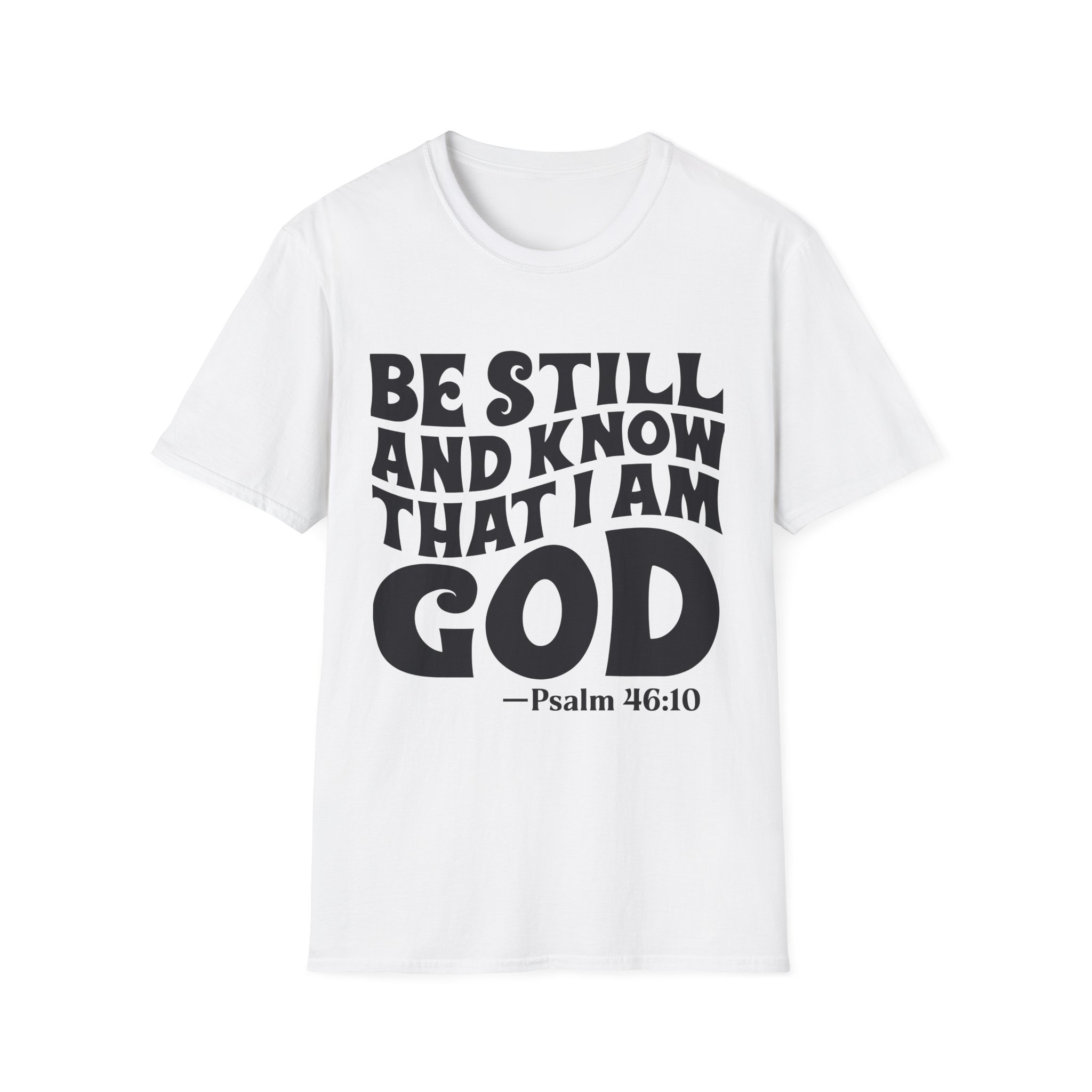 Wear this shirt like a quiet anchor. The bold, hand-lettered Psalm across the chest calls for a slow breath and a steady heart. It settles the room without raising its voice — a simple reminder to pause, pray, and listen. Lightweight and soft against the skin, it layers easily under a sweater for cooler mornings or stands alone during warm fellowship hours. Choose this tee when you want your faith to speak calmly but clearly, whether you’re folding bulletins at the church kitchen, heading out to a weekend retreat, or sitting in the hush of early morning devotion.