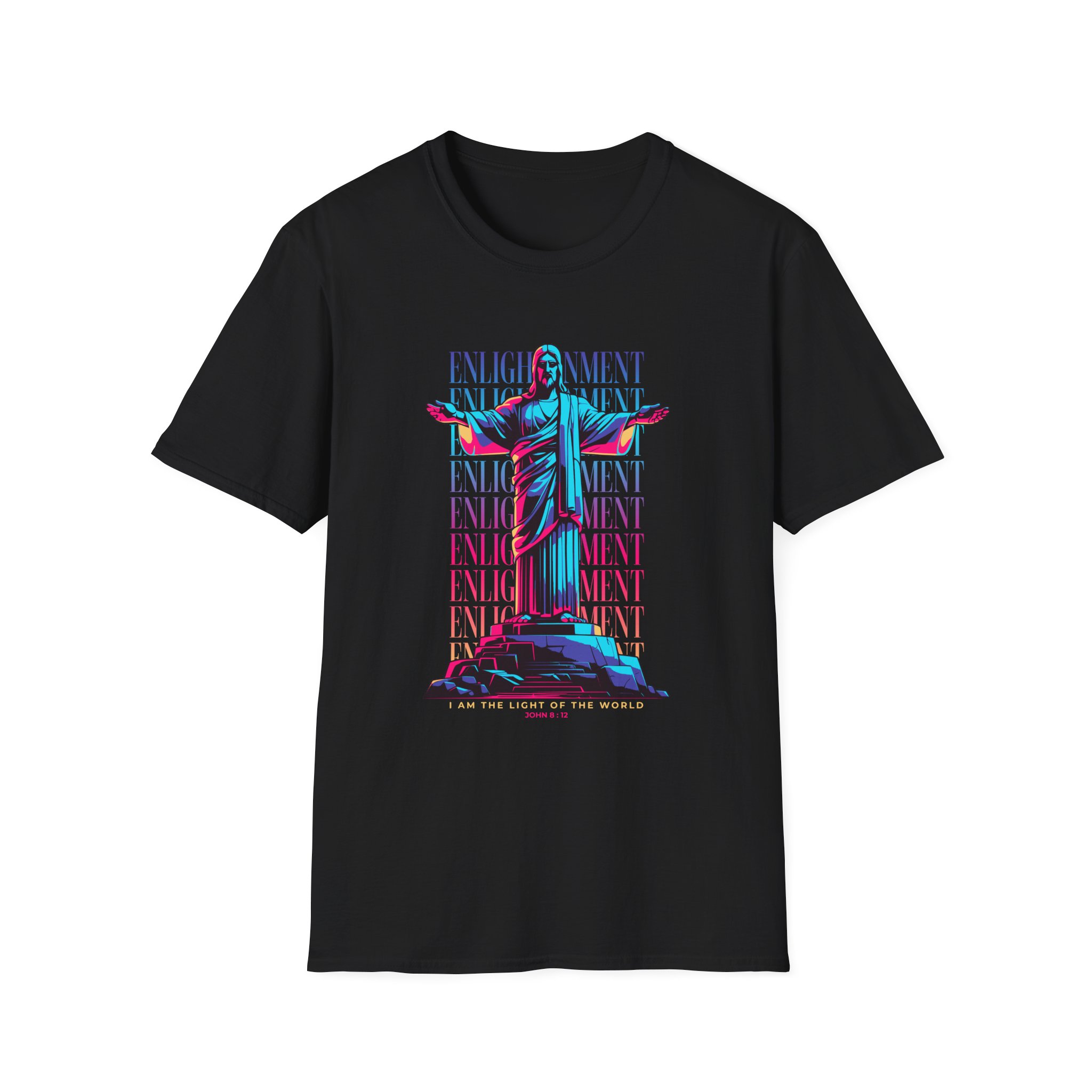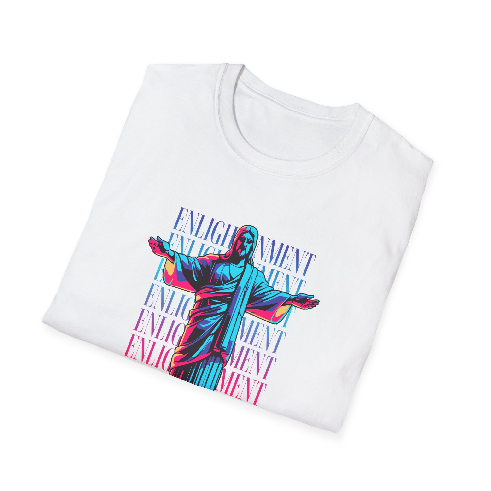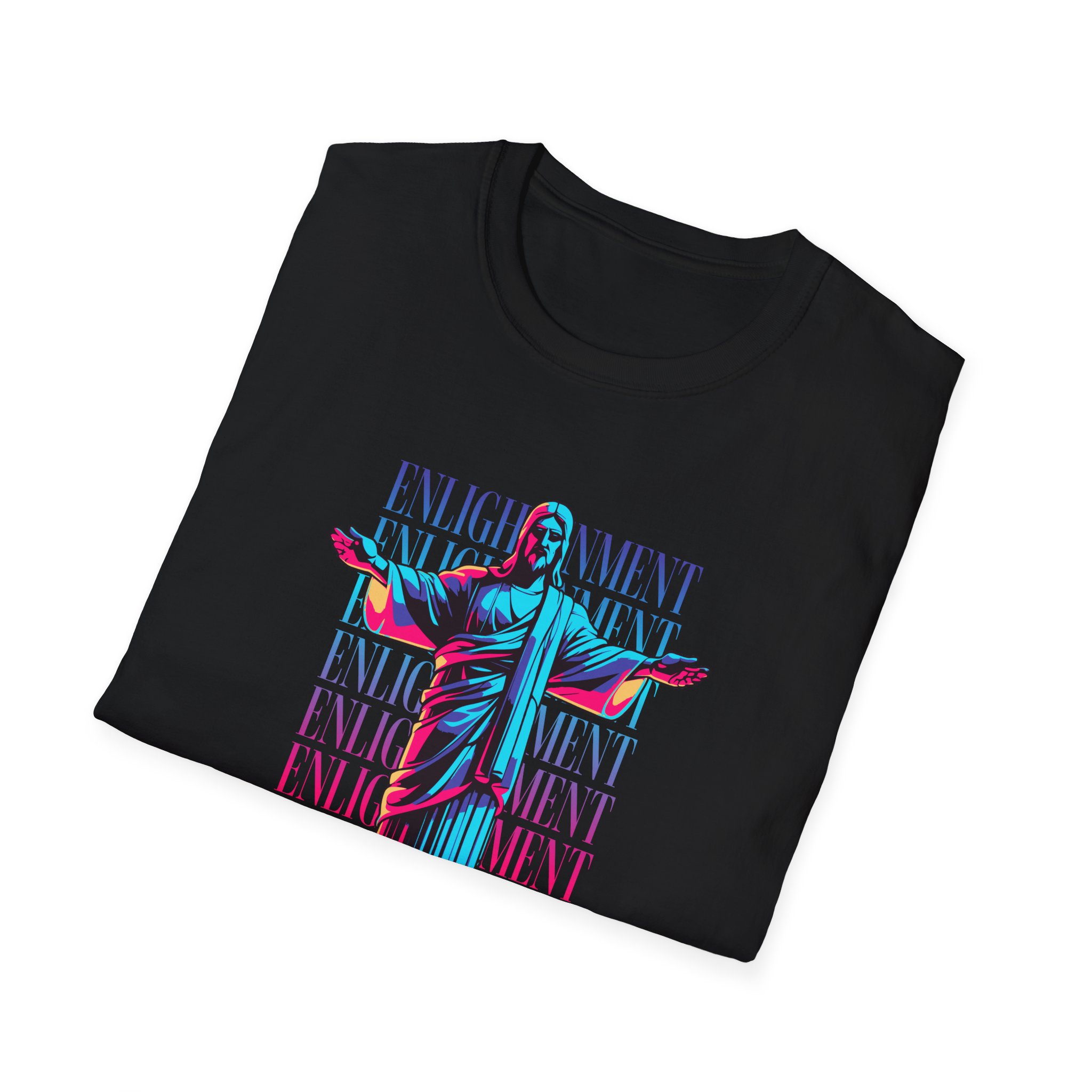 A lightweight, breathable tee printed with a bold, neon-glitch illustration of a welcoming statue layered over repeating “ENLIGHTENMENT” text. The shirt mixes streetwear energy with contemplative symbolism — it looks like something grabbed from a late-night gallery or a city rooftop at dawn. Soft ring-spun cotton drapes easily, the ribbed crew neck keeps its shape, and the tubular knit gives a clean, seam-free silhouette that reads modern and simple. Wear it when you want an art-forward piece that starts conversations and holds up through frequent wear and washes.