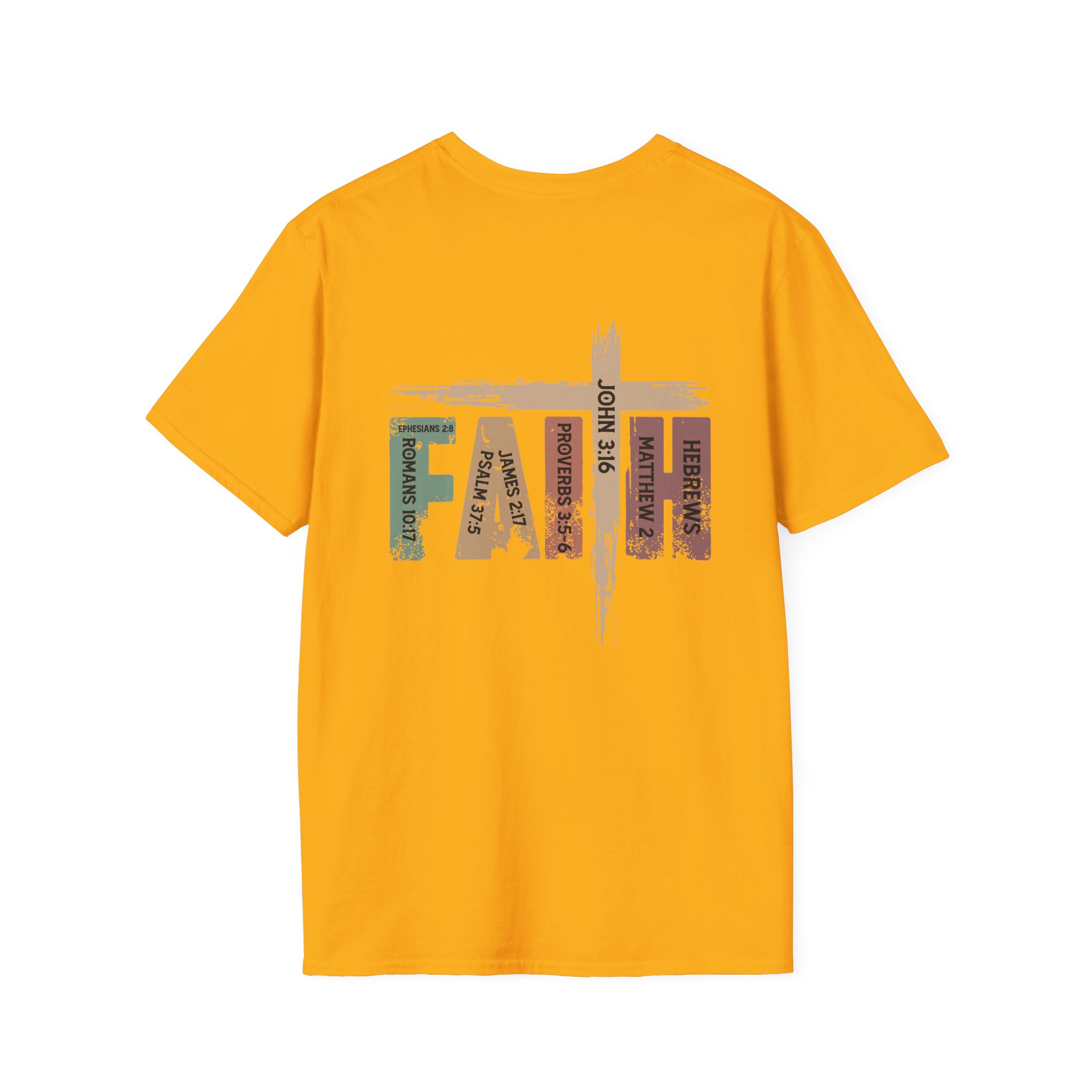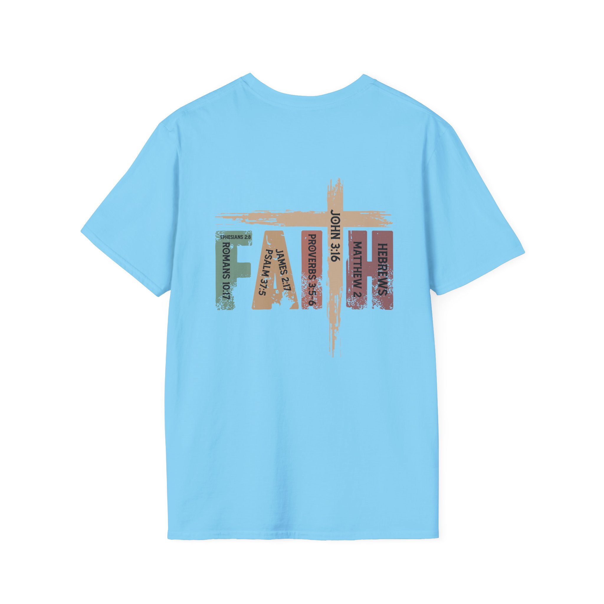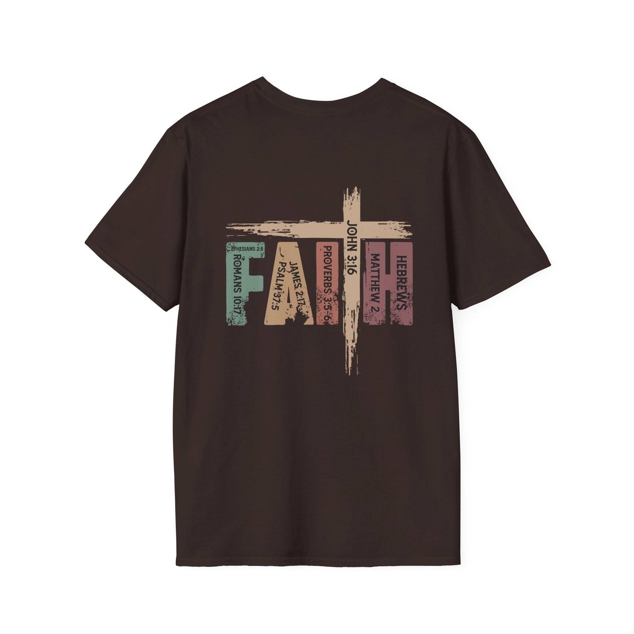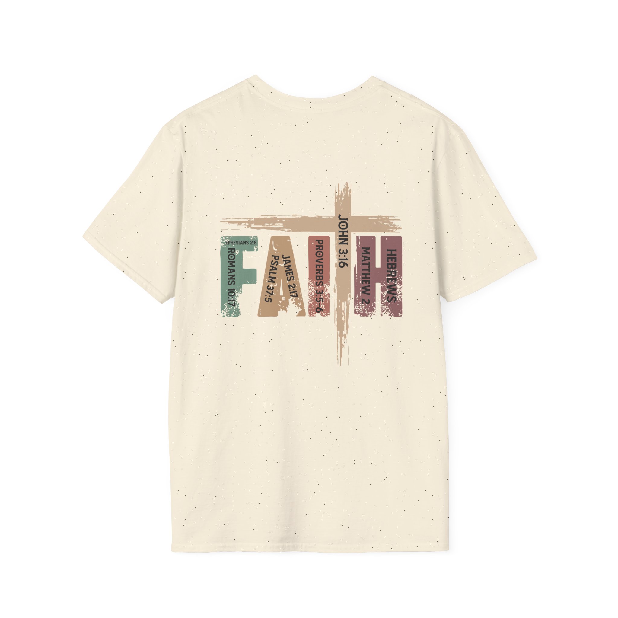 Lightweight, breathable cotton tee with a quiet, faith-forward design that reads like a worn poster from a long walk home. The front carries a small, hand-painted cross over the heart; the back unfolds the word FAITH in textured, layered brushstrokes and earth-toned panels. It wears like a lived-in favorite—soft at the neck, smooth across the chest, and easy to move in—so the message feels natural, not staged. Wear it to small-group meetings, Sunday strolls, volunteer days, or when you want your convictions to be felt more than advertised.