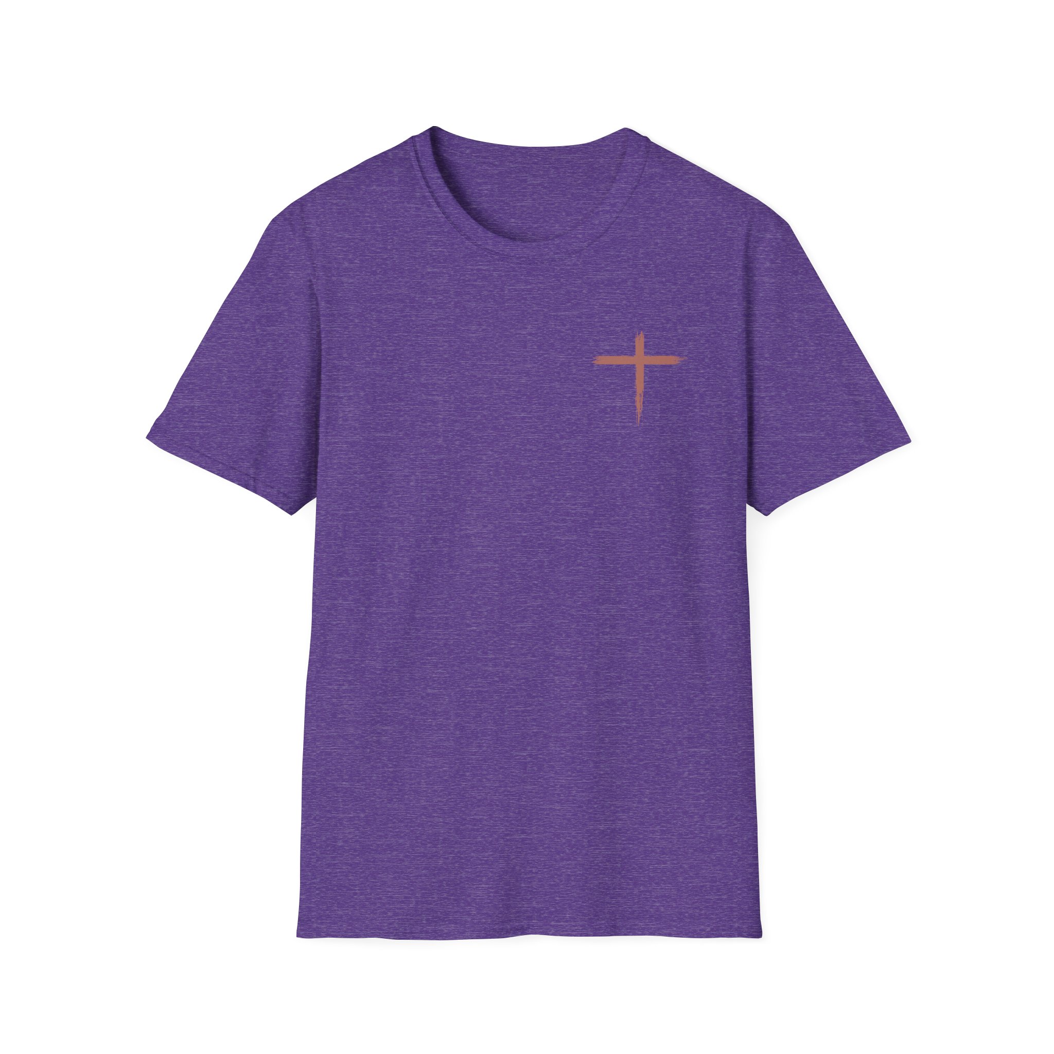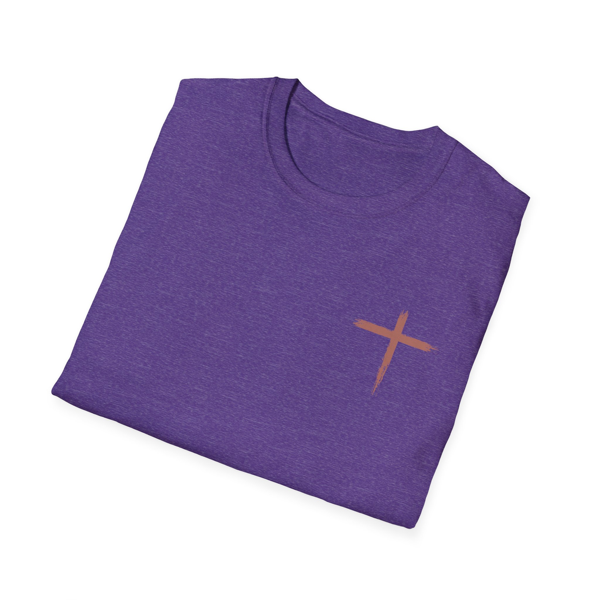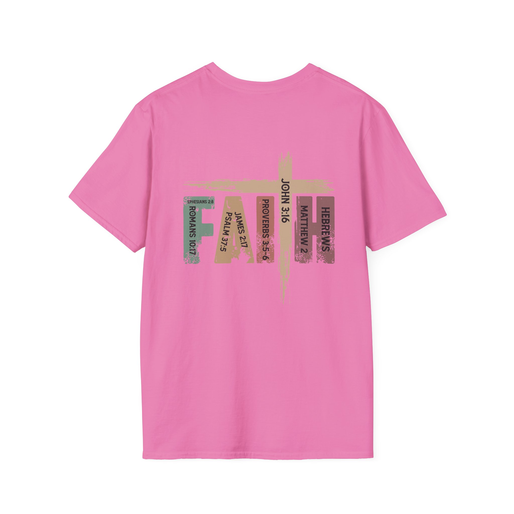Lightweight, breathable cotton tee with a quiet, faith-forward design that reads like a worn poster from a long walk home. The front carries a small, hand-painted cross over the heart; the back unfolds the word FAITH in textured, layered brushstrokes and earth-toned panels. It wears like a lived-in favorite—soft at the neck, smooth across the chest, and easy to move in—so the message feels natural, not staged. Wear it to small-group meetings, Sunday strolls, volunteer days, or when you want your convictions to be felt more than advertised.
