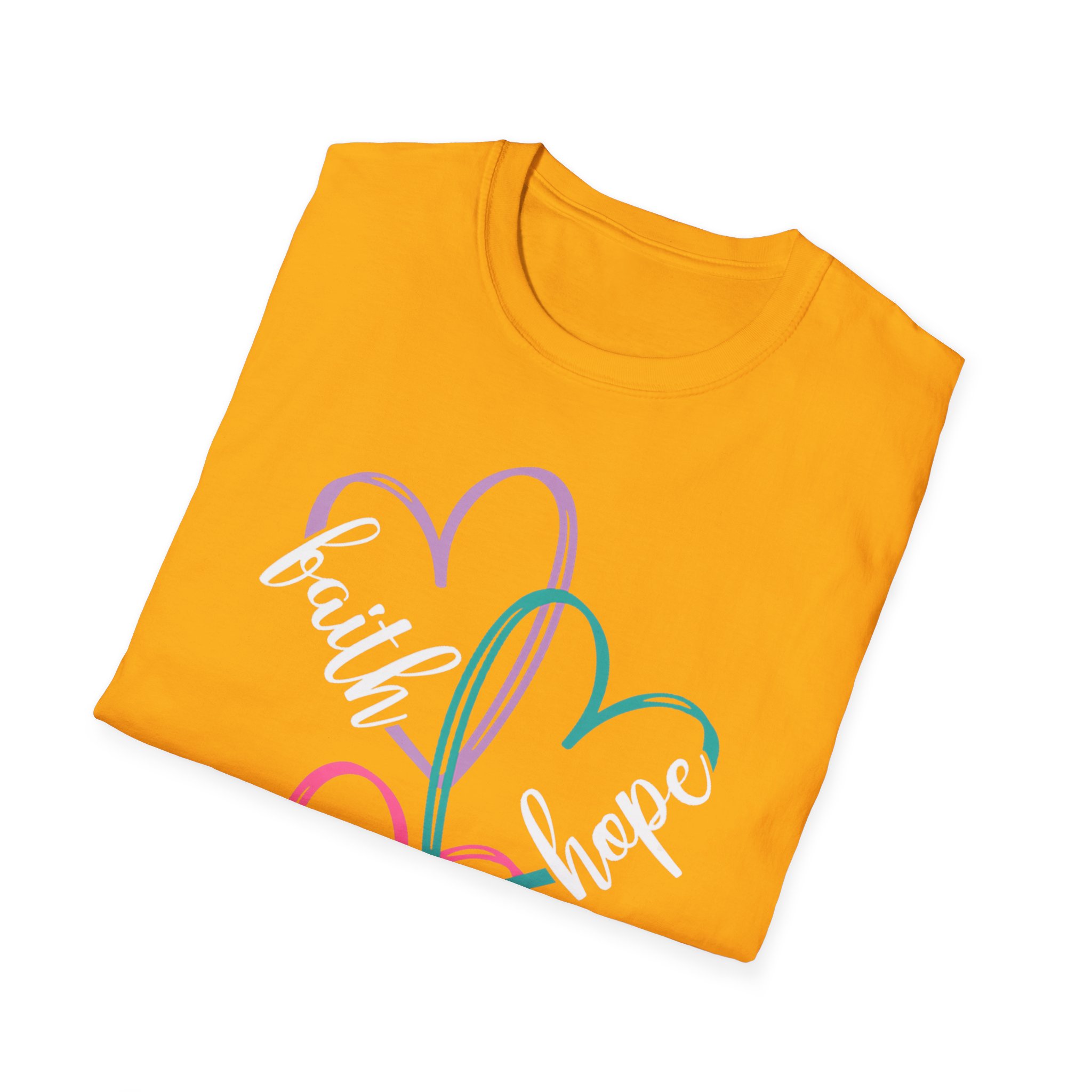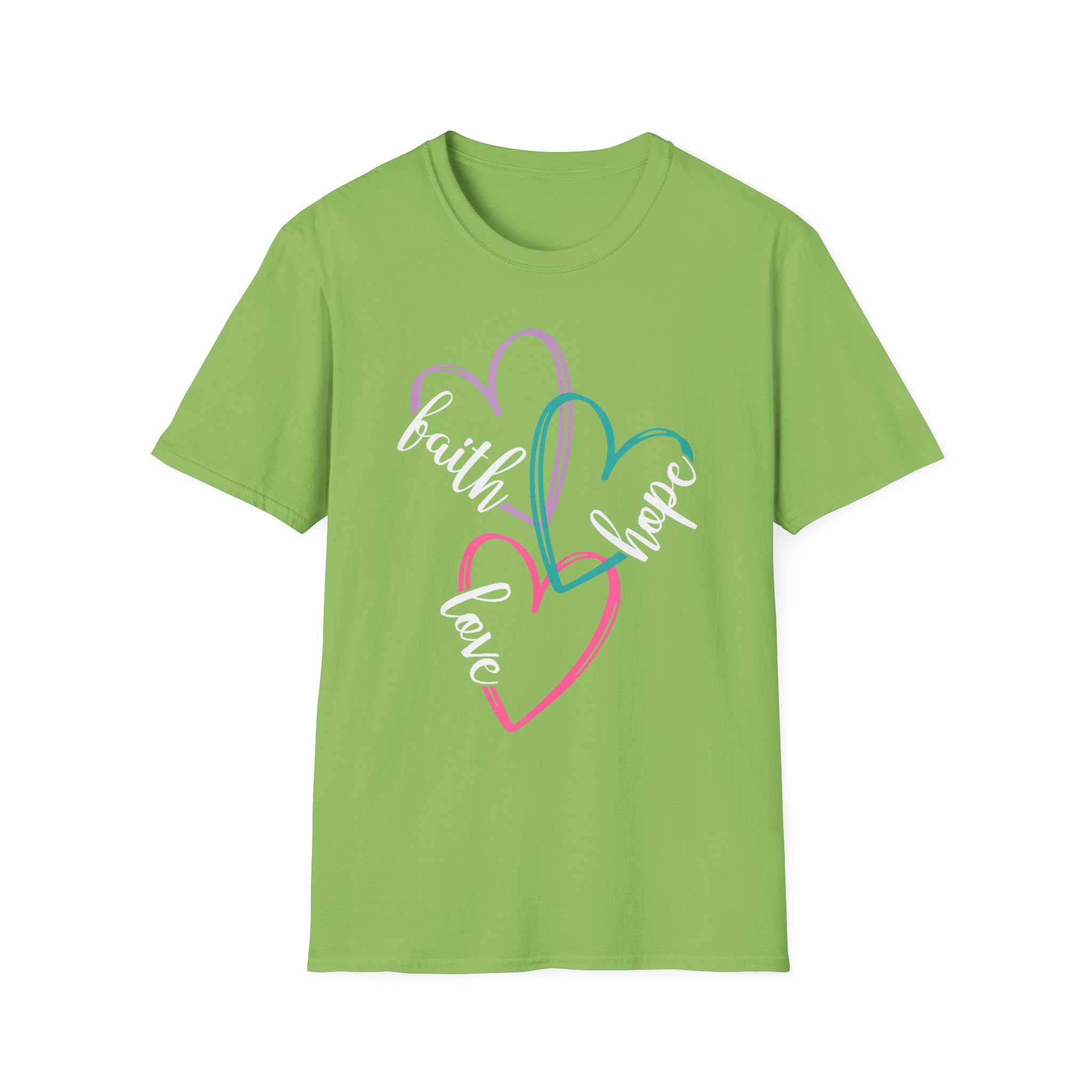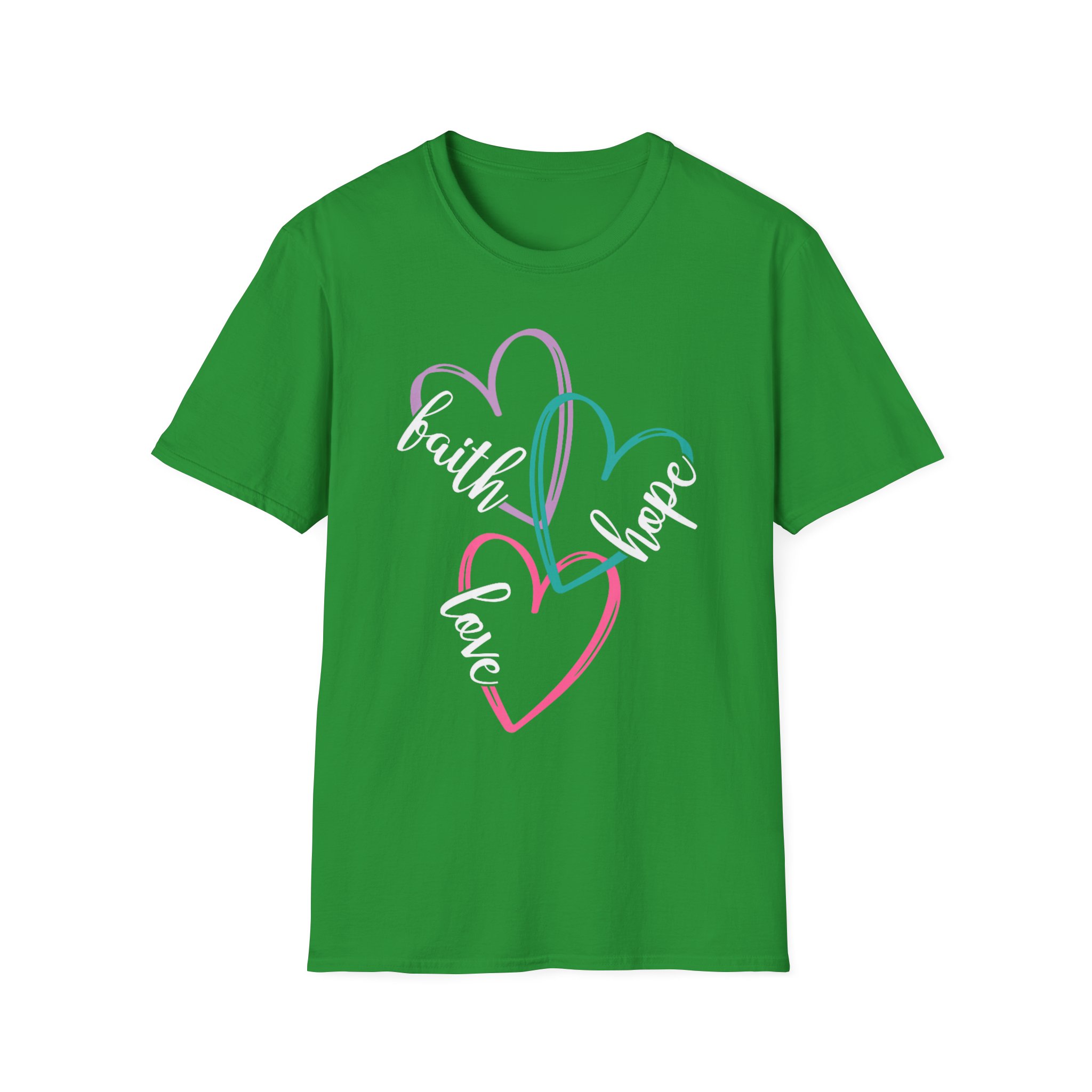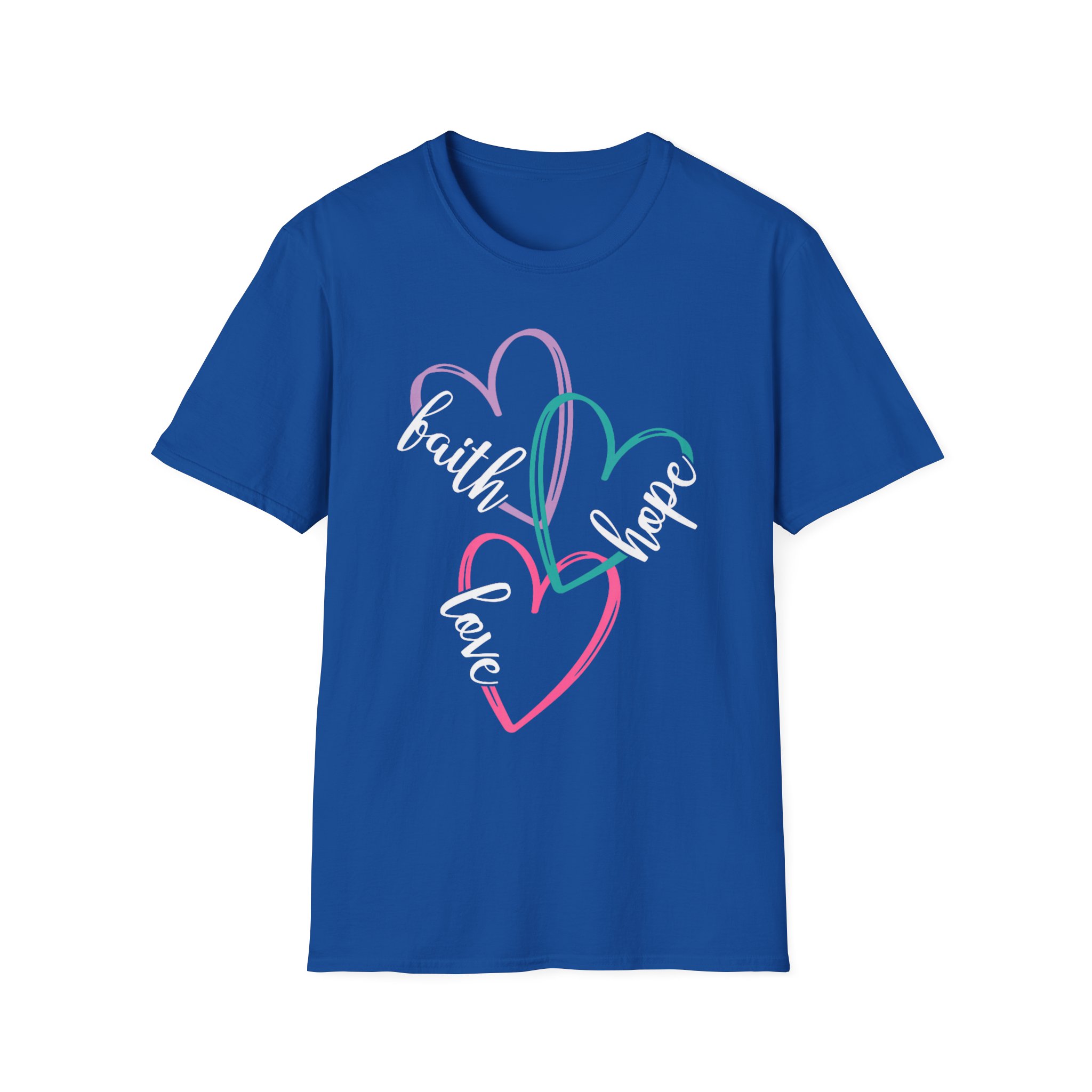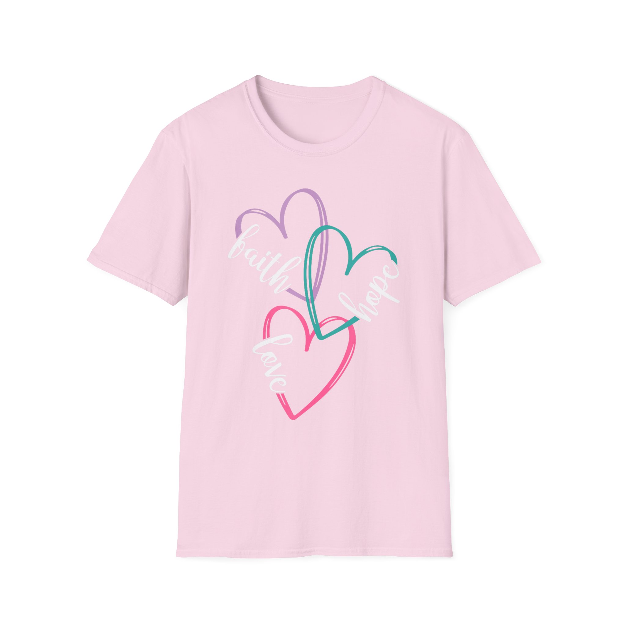 Soft, simple, and quietly hopeful — this lightweight tee carries three overlapping hand-drawn hearts in soft pastel strokes, each embroidered with a single word: faith, hope, love. It sits cleanly at the chest on a classic crew silhouette, so the message reads like a calm reminder during whatever your day brings. Wear it over jeans for an easy coffee run, layer it under a cardigan for a gentle church or community meeting, or pack it for missions and volunteer days when comfort and meaning matter. The breathable ring-spun cotton feels smooth against the skin and holds printed detail beautifully, while the tear-away label and stable shoulder tape keep it comfortable through repeated wear. Ethically sourced cotton and Oeko-Tex certification mean you can focus on the people you’re with, not the shirt you’re wearing.
