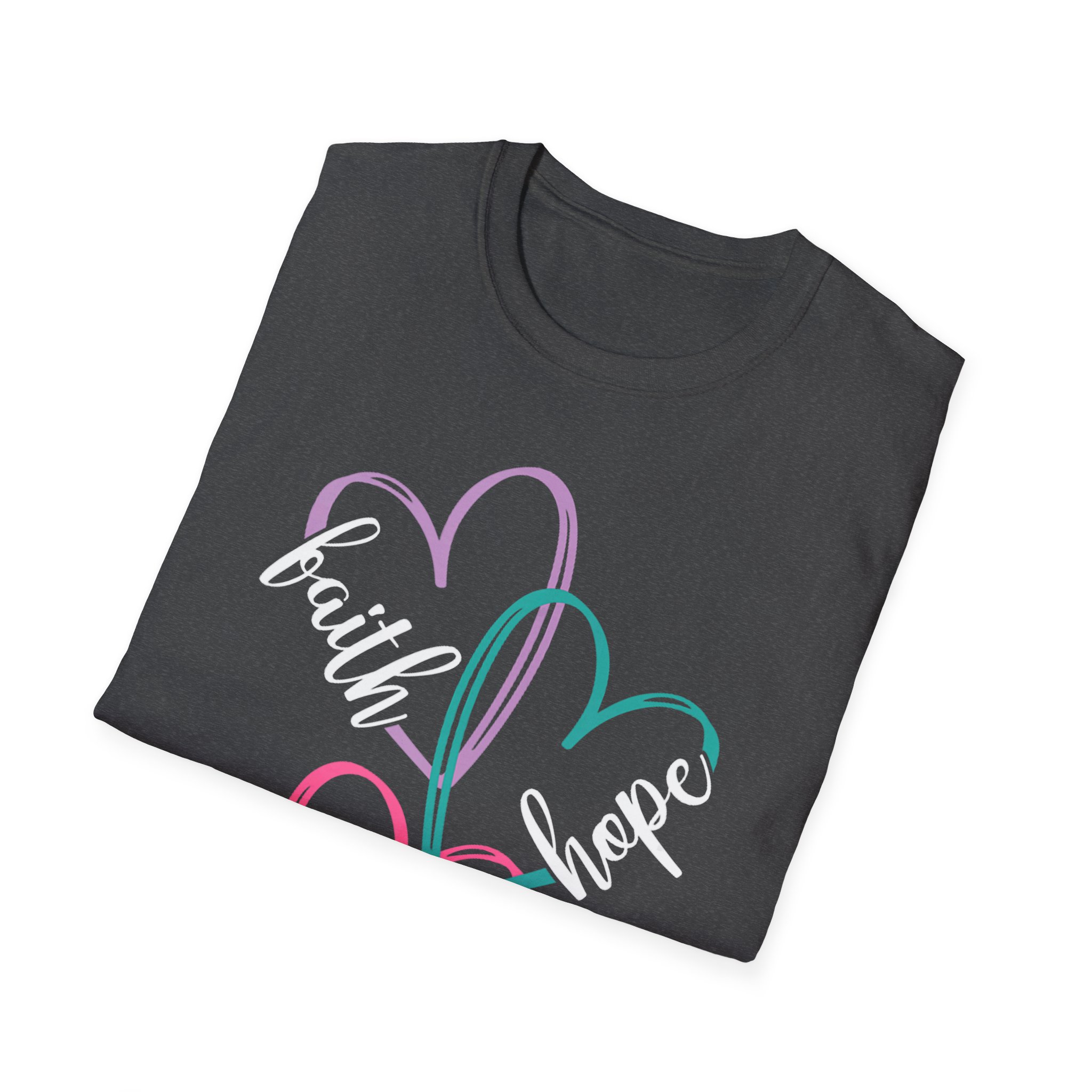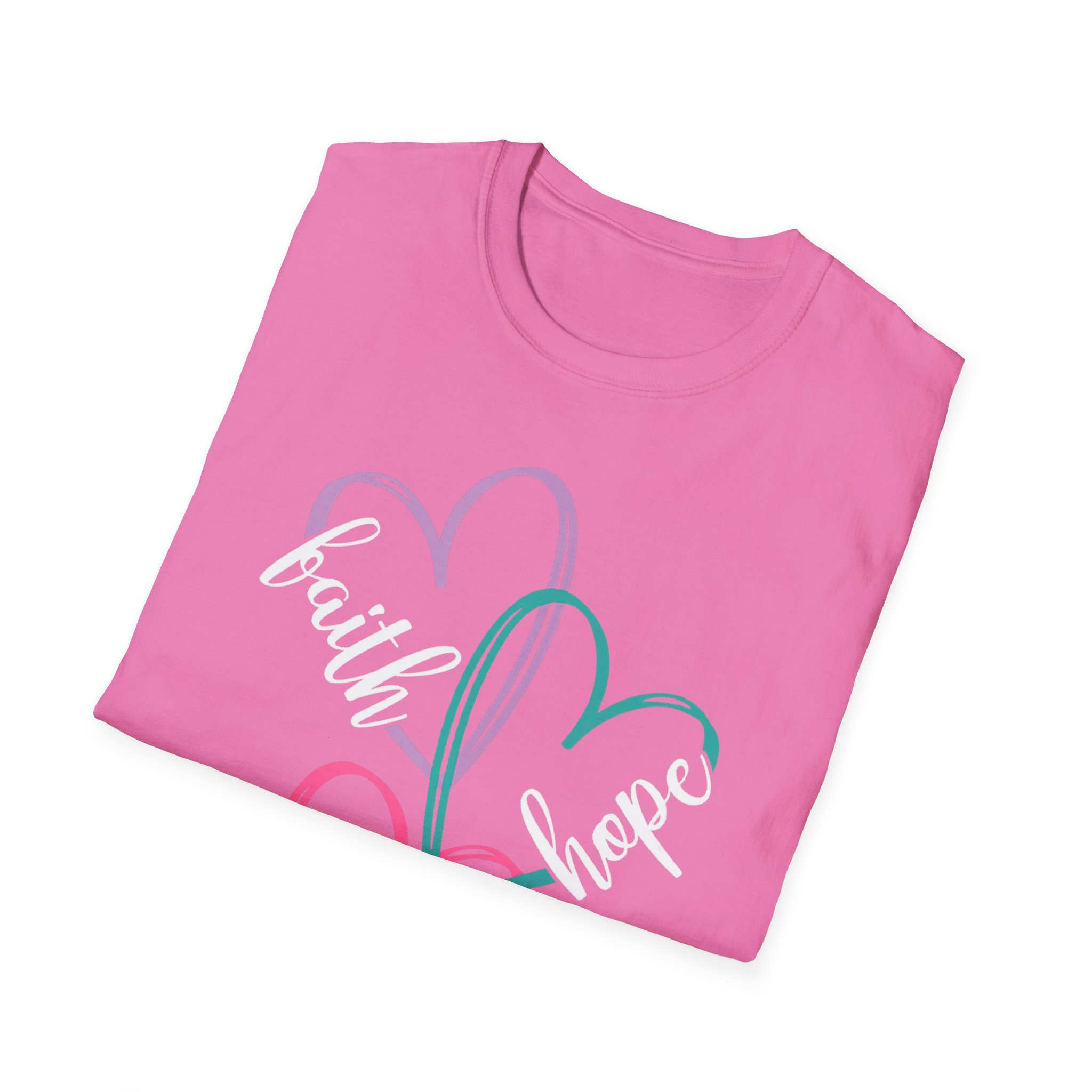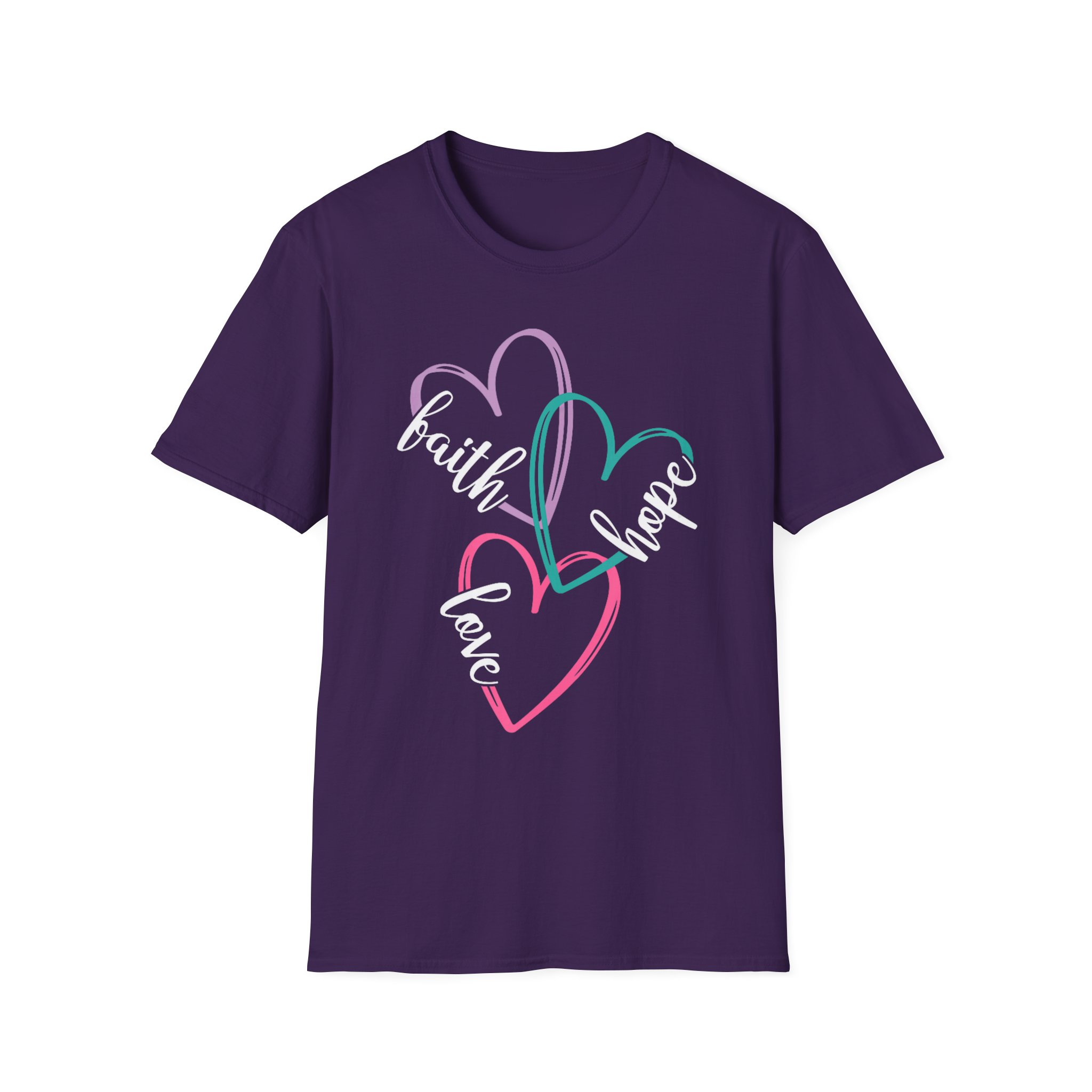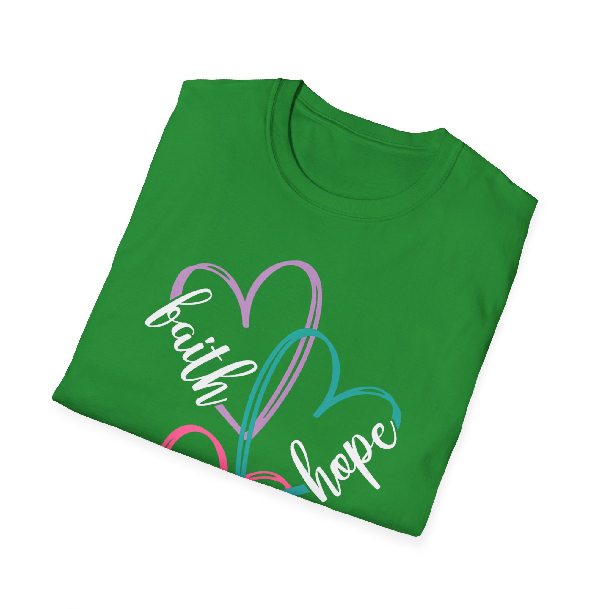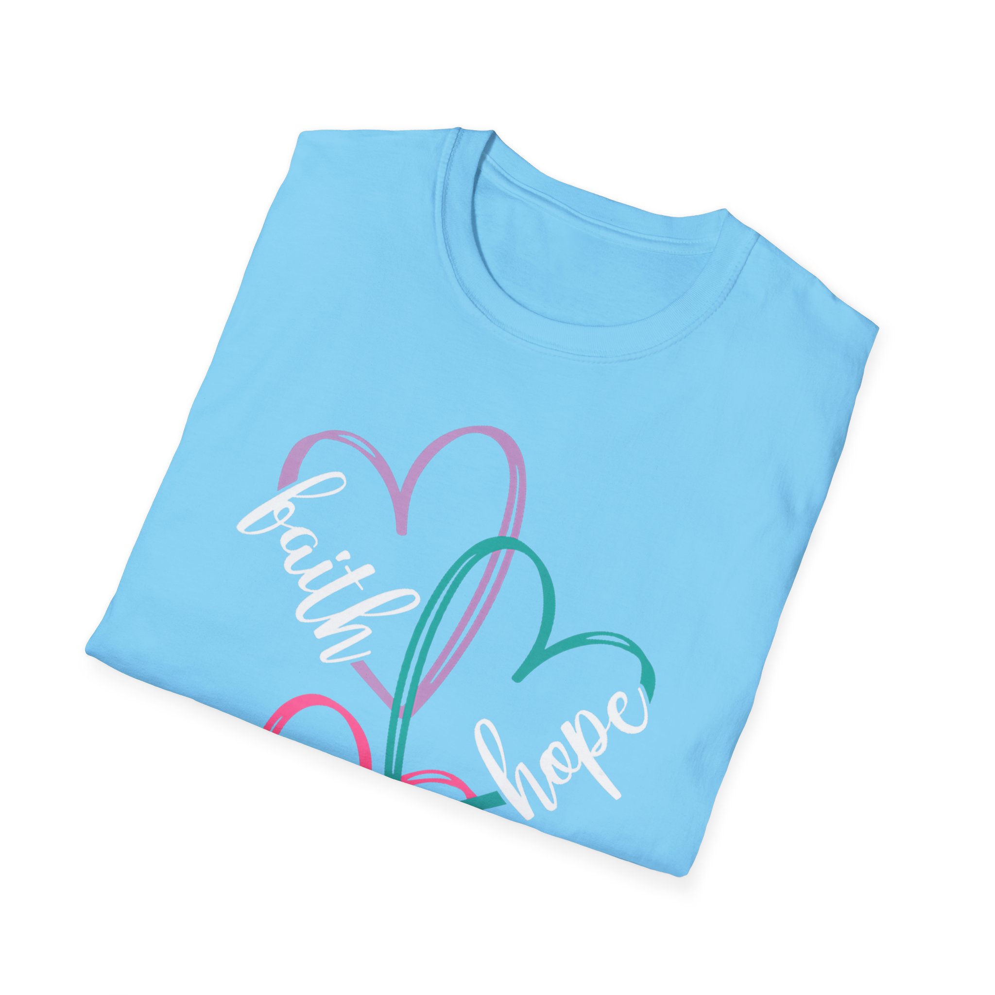 Soft, simple, and quietly hopeful — this lightweight tee carries three overlapping hand-drawn hearts in soft pastel strokes, each embroidered with a single word: faith, hope, love. It sits cleanly at the chest on a classic crew silhouette, so the message reads like a calm reminder during whatever your day brings. Wear it over jeans for an easy coffee run, layer it under a cardigan for a gentle church or community meeting, or pack it for missions and volunteer days when comfort and meaning matter. The breathable ring-spun cotton feels smooth against the skin and holds printed detail beautifully, while the tear-away label and stable shoulder tape keep it comfortable through repeated wear. Ethically sourced cotton and Oeko-Tex certification mean you can focus on the people you’re with, not the shirt you’re wearing.