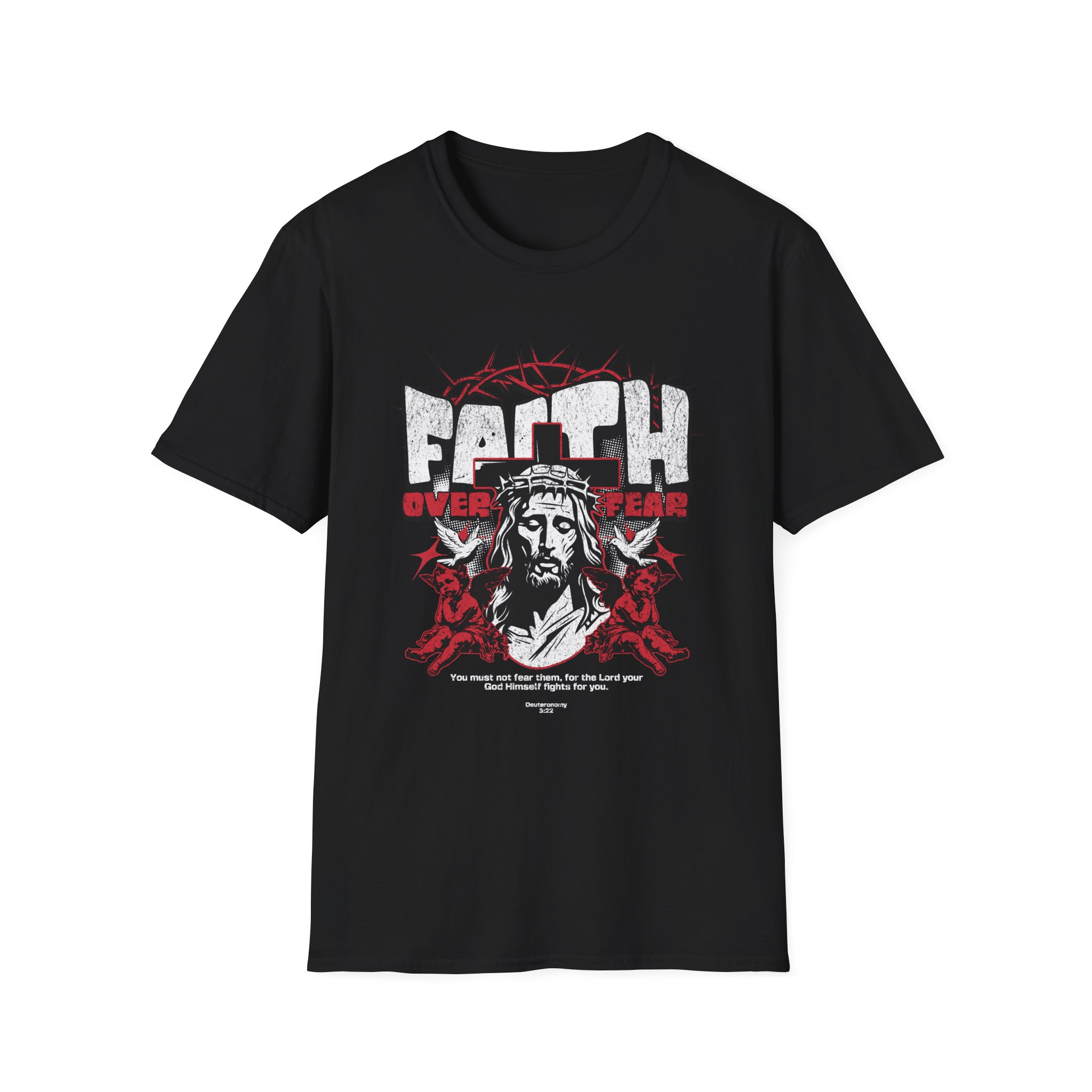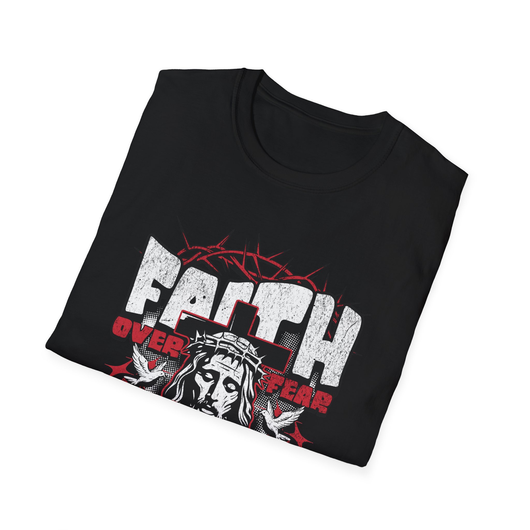 A soft, breathable tee that carries a bold message. This lightweight crewneck sits close to the body without feeling tight, letting the printed design — a striking, distressed portrait framed by barbed wire and the words ‘Faith Over Fear’ — take the stage. Wear it to church nights, outreach events, or quiet mornings of reflection. The cotton feels smooth against skin and the ribbed collar keeps its shape wash after wash. It layers easily under jackets or over hoodies and holds up to regular wear thanks to reinforced shoulder tape and durable ring-spun cotton. This shirt reads like a statement and wears like a trusted staple you reach for when you want to carry courage with you.