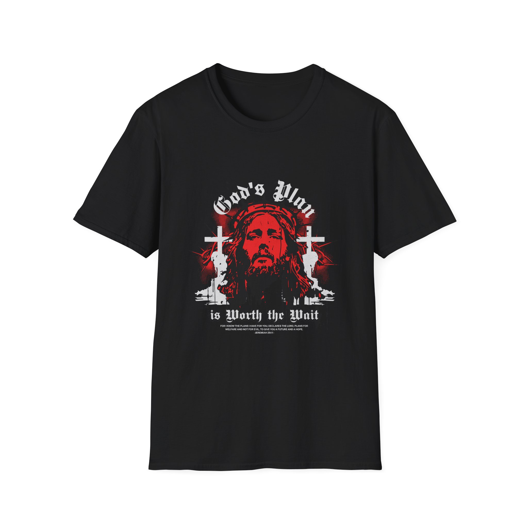 A soft, breathable tee that carries quiet conviction. The black crewneck features a distressed, red-and-white devotional graphic—centered on a serene visage and flanked by crosses—with the phrase “is Worth the Wait” woven into the design. Lightweight ring-spun cotton feels gentle against the skin and drapes naturally for an easy, lived-in look. Wear it to church gatherings, volunteer days, youth group meetups, or on reflective weekends when you want your faith to speak without shouting. The tear-away label and stable shoulder tape keep it comfortable through repeated wear and washes, while the durable knit and print methods hold up to everyday life.