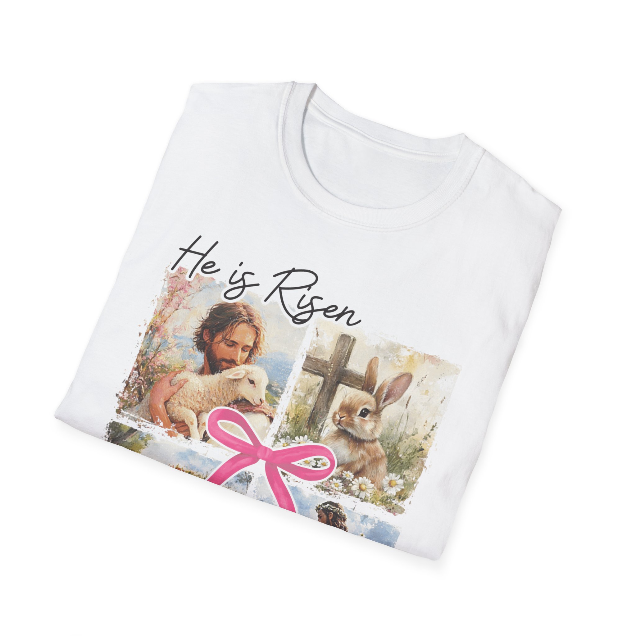 Soft, lightweight cotton with a gentle crew neckline and a calm, hopeful design—this tee feels like a quiet Sunday morning. Delicate vintage-style panels show scenes of the Resurrection with a soft pastel palette and a hand-drawn pink ribbon at the center. Handwritten script reads “He is Risen” with the Matthew 28:6 reference beneath, giving the shirt a devotional, reflective tone. Wear it to a sunrise service, a family brunch after church, or tucked into a skirt for a modest, faith-forward look. The breathable fabric and classic fit keep the focus on the message without fuss, while the smooth print preserves the artwork’s watercolor textures. This shirt settles easily into the rhythm of a person who values gentle faith expressions and meaningful traditions.