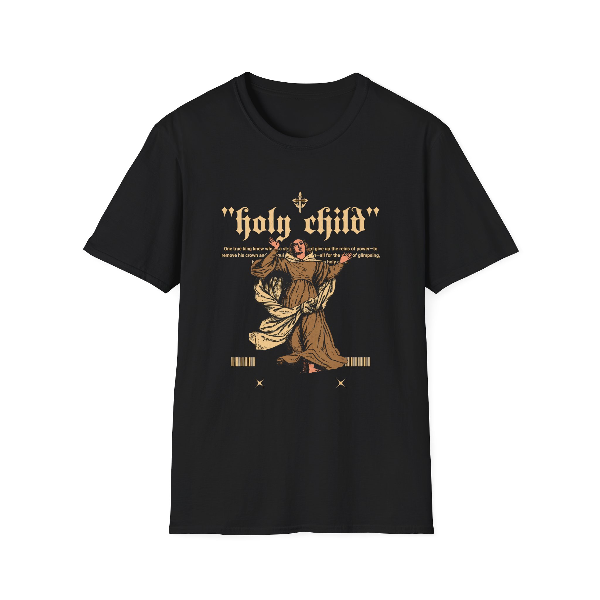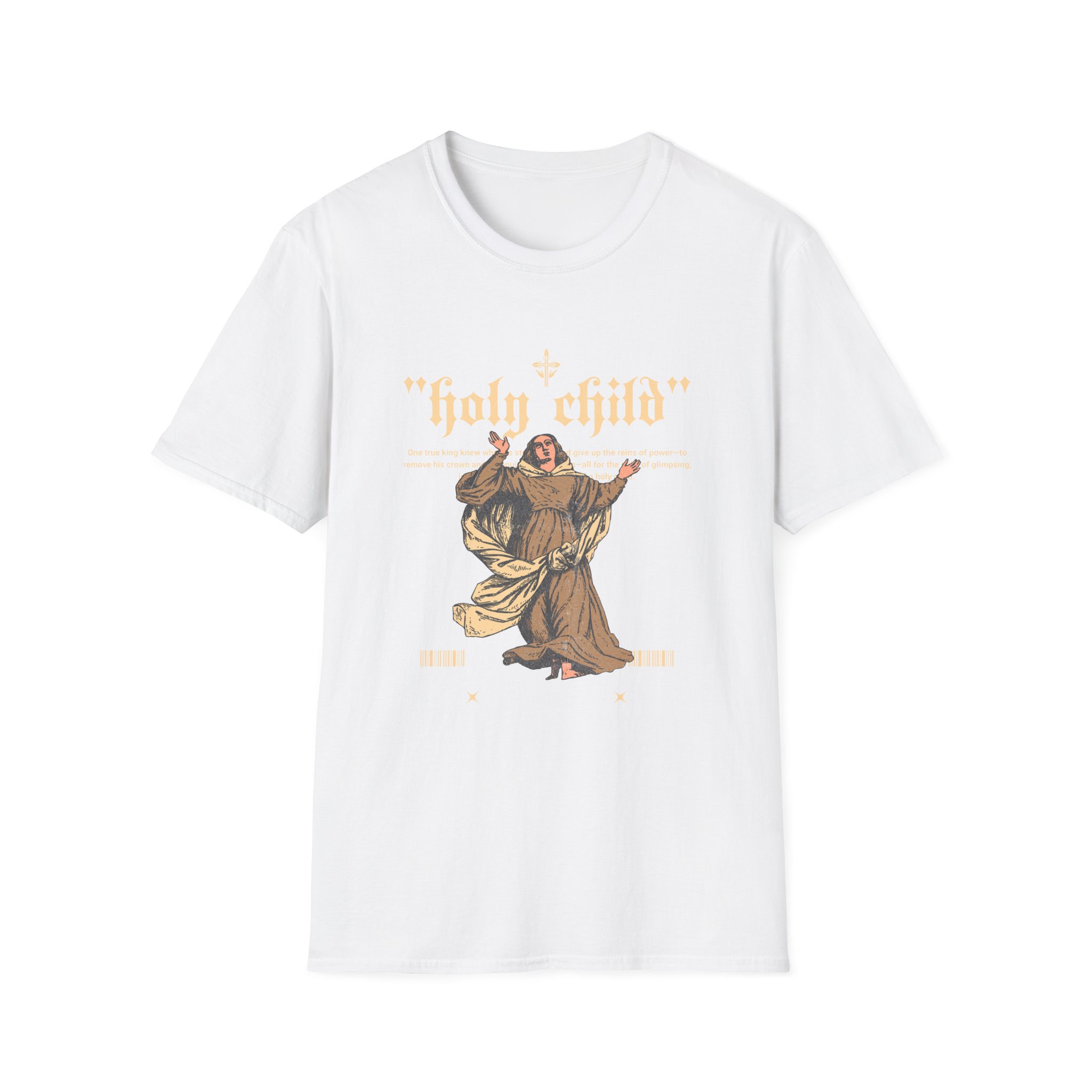 This soft cotton tee carries a quiet, devotional energy. A vintage-style illustration of a joyous, robed figure centers the front, captioned in warm, faded lettering that reads “holy child.” The lightweight, smooth fabric drapes gently and keeps the print feeling like part of the shirt rather than a separate layer. Wear it during reflective mornings, community gatherings, or slow afternoons when you want clothing that whispers faith and warmth rather than shouts it. The crew neckline and classic fit make it easy to layer under a cardigan or show off on its own. It’s the kind of shirt you reach for when you want comfort with meaning — a simple way to carry a gentle reminder through everyday life.
