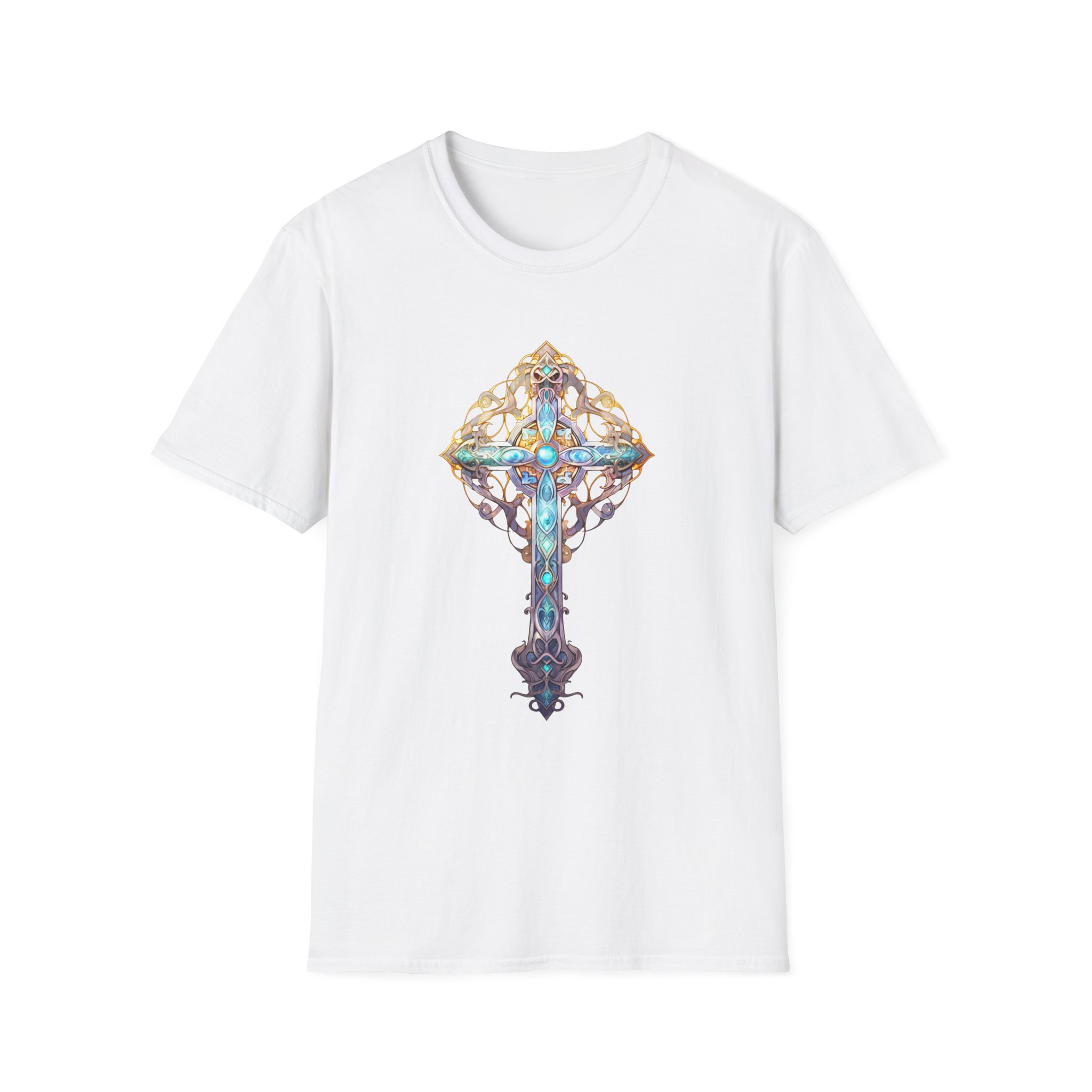 A lightweight, year-round tee built for comfort and quiet statement. This softstyle cotton shirt carries a detailed, jewel-toned cross motif at the chest — ornate filigree, weathered metal tones, and touches of turquoise and gold that look handcrafted. It sits cleanly on the body with a classic crew neckline and tubular knit construction that keeps the silhouette smooth. Wear it layered under a cardigan for contemplative mornings, or loose with jeans when you want breathability and subtle artistry in your outfit. The printed inner neck and optional sleeve details keep the exterior minimal while offering quality that lasts wash after wash.