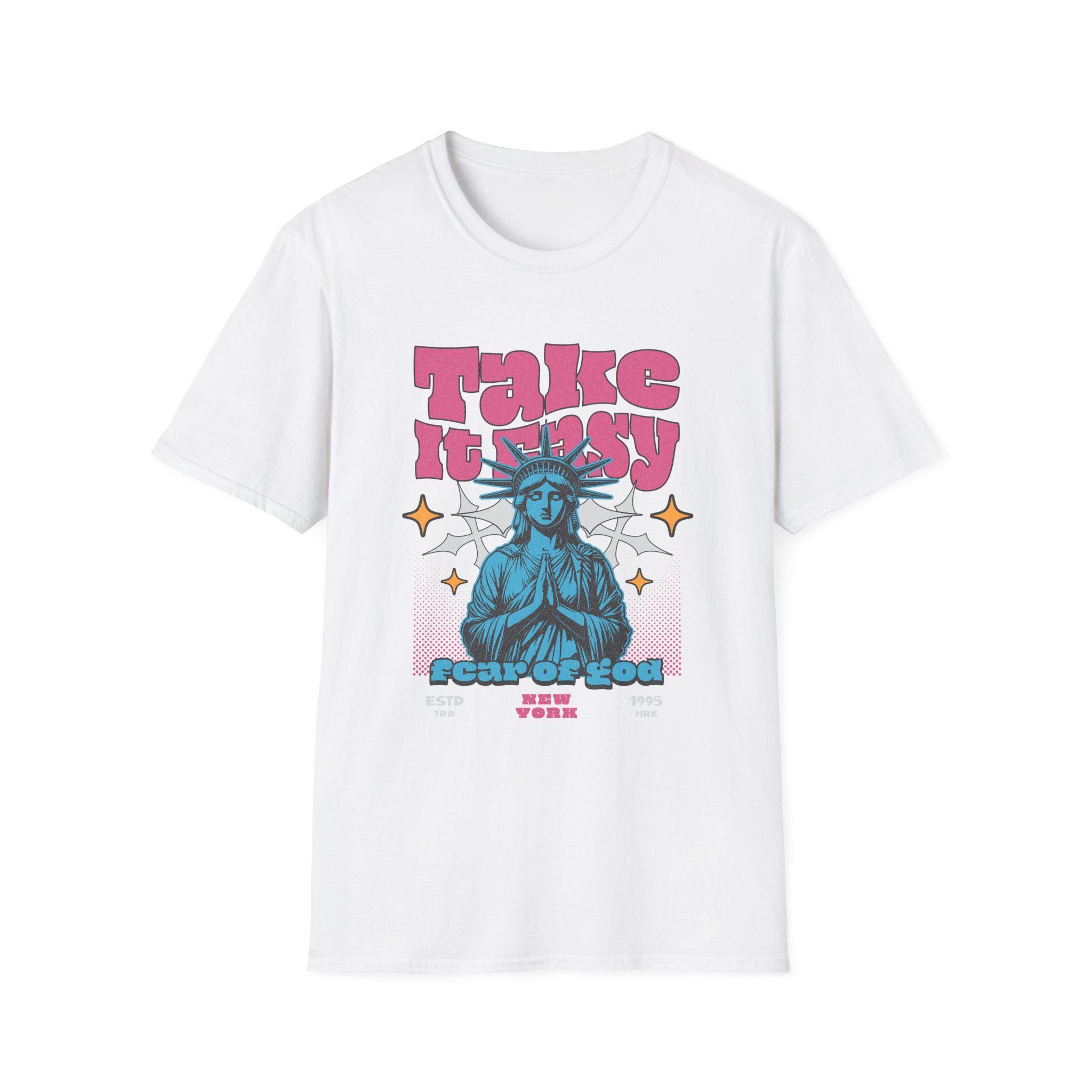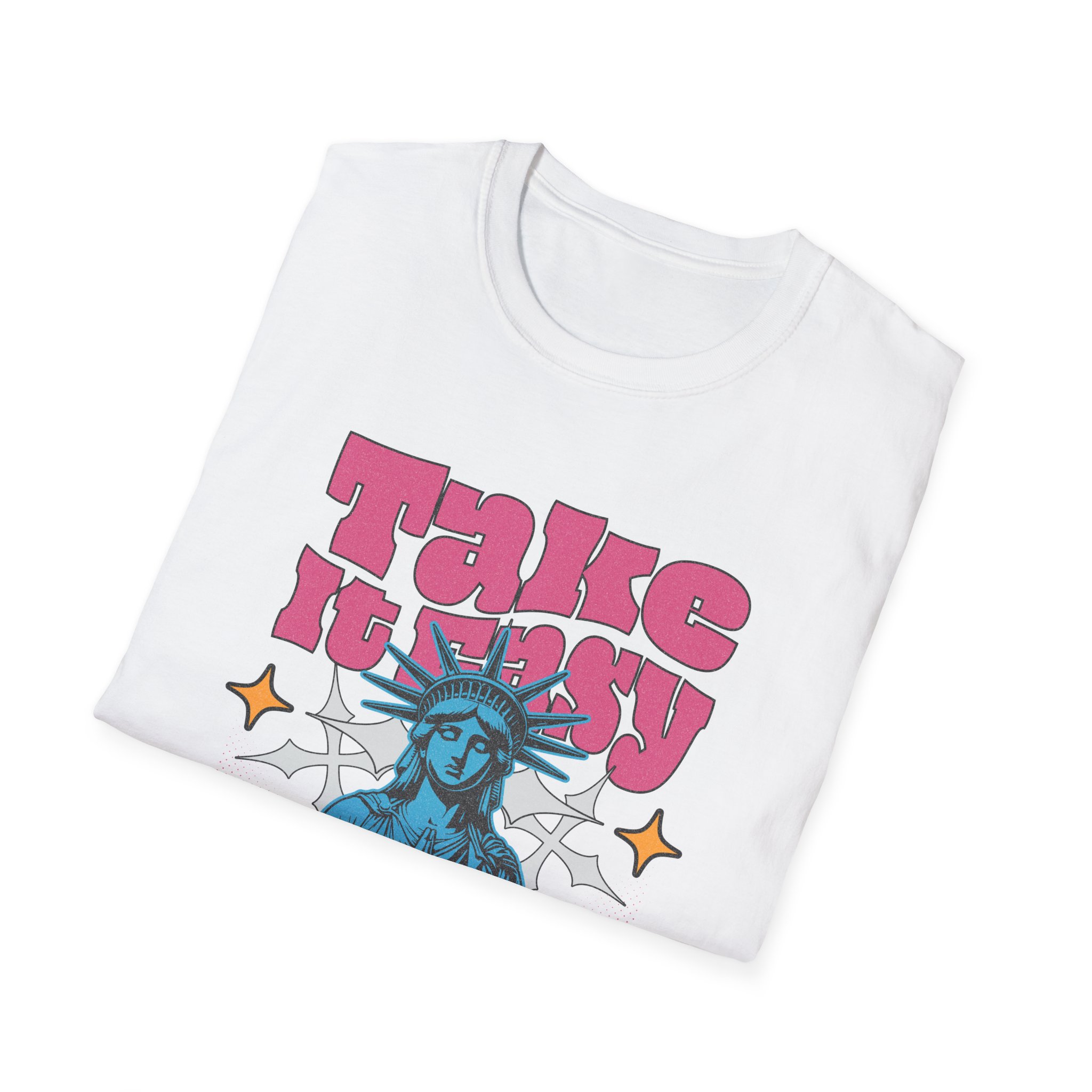 This lightweight crewneck tee carries a bold, retro-meets-street art vibe — a blue Statue of Liberty illustration set beneath playful, chunky pink lettering that reads “Take it easy.” The print blends vintage poster colors with a slightly distressed, screen-printed look that sits crisply on soft, ring-spun cotton. Wear it on busy city days, at relaxed weekend hangs, or layered under a jacket for a splash of nostalgic attitude. The fit is classic and roomy without feeling oversized, and the smooth fabric keeps the graphic bright through repeated washes. It’s a casual statement piece for anyone who likes urban energy with a laid-back twist.